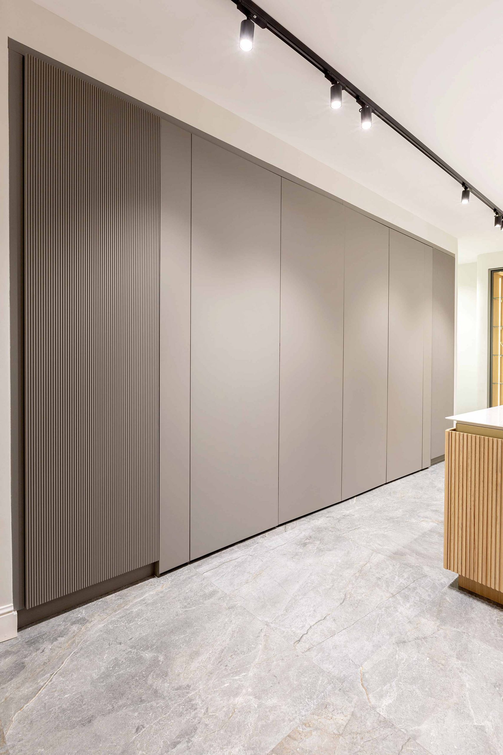 La búsqueda de orden y limpieza visual impulsa el desarrollo de sistemas de almacenaje más avanzados. Los armarios de suelo a techo, los cajones de gran capacidad y las guías y herrajes de extracción total permiten aprovechar cada centímetro sin renunciar al diseño. Las cocinas tienden a ocultar los electrodomésticos y elementos técnicos mediante puertas escamoteables y módulos integrados, creando superficies continuas que unifican el conjunto. La funcionalidad se vuelve invisible, reforzando la sensación de armonía y fluidez.