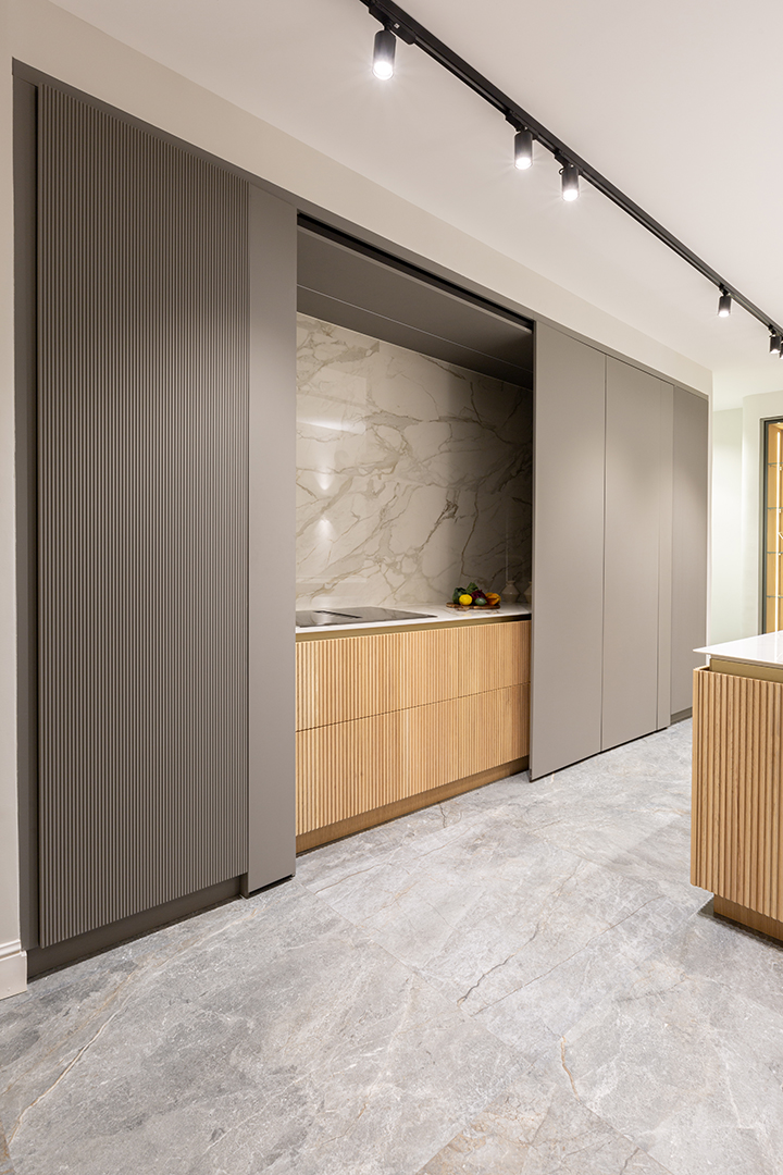 El diseño de cocinas en 2026 mantiene la apuesta por materiales naturales y acabados sensoriales de aspecto artesanal y de elaboración manual. La madera sigue siendo protagonista por su calidez, sostenibilidad y capacidad de conexión emocional con el entorno. Los tonos neutros —blanco, arena, beige y gris suave— dominan las paletas cromáticas, aportando serenidad y luminosidad, mientras que los matices verdes y azules, que establecen una conexión con la naturaleza, introducen una nota orgánica que evoca bienestar. El uso de piedra texturizada, cristal ahumado y metales en acabado mate aporta profundidad y sofisticación. El resultado son cocinas equilibradas, atemporales y coherentes con una estética más natural y consciente.