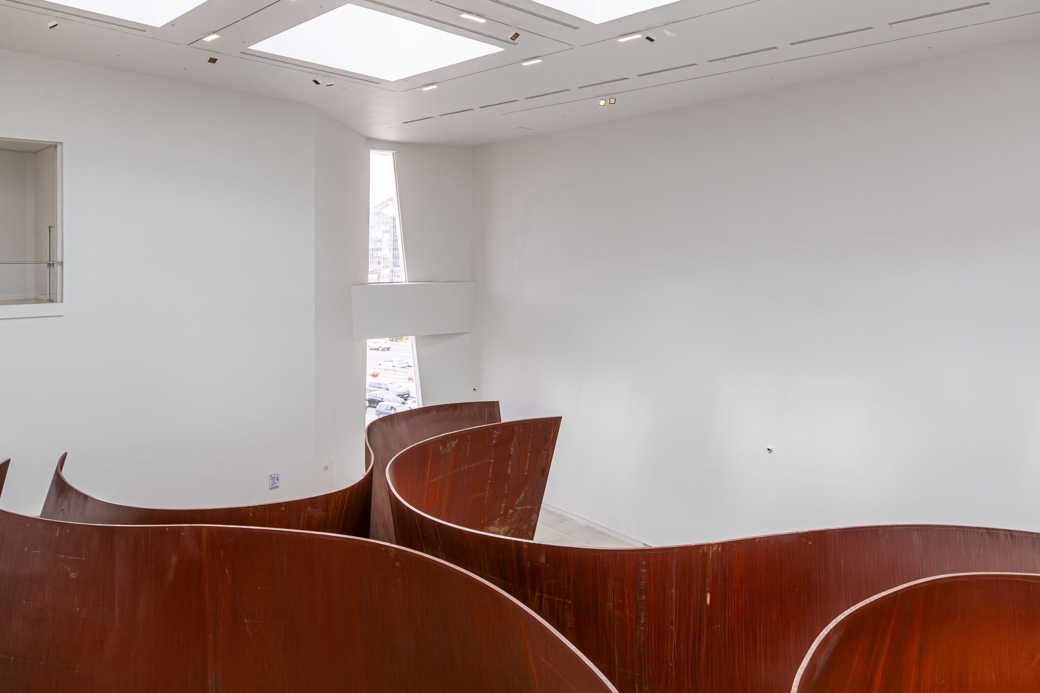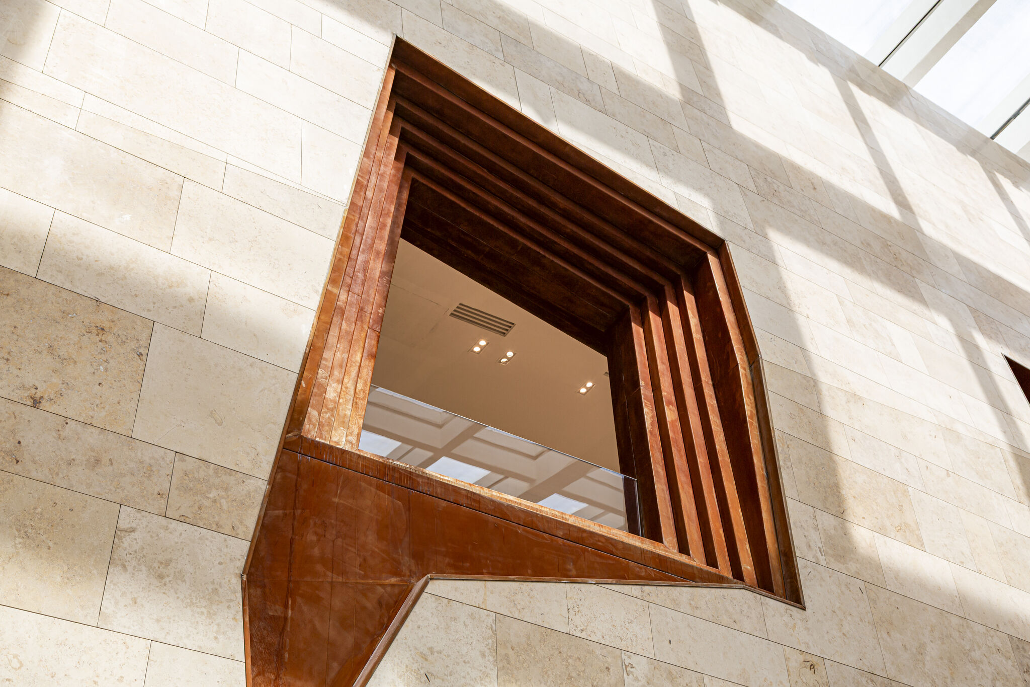 Su composición, formada por dos estructuras en forma de “L” entrelazadas —una revestida en piedra caliza y otra en aluminio—, simboliza la armonía entre el paisaje natural y la vitalidad urbana.