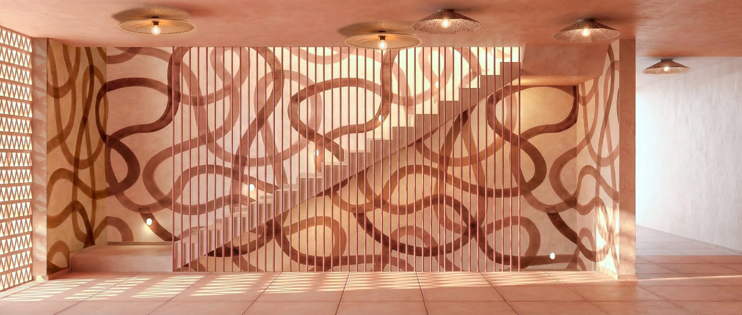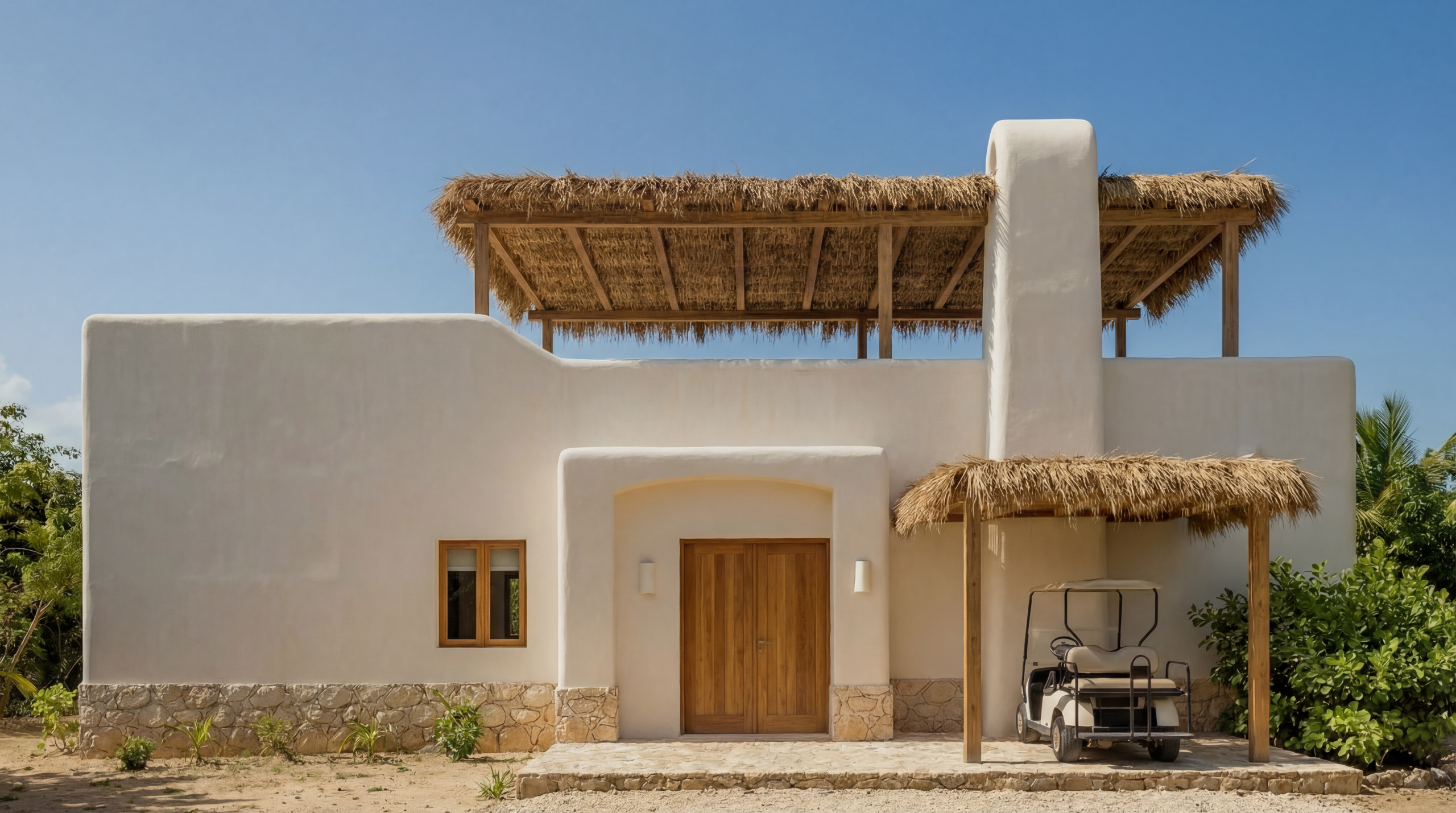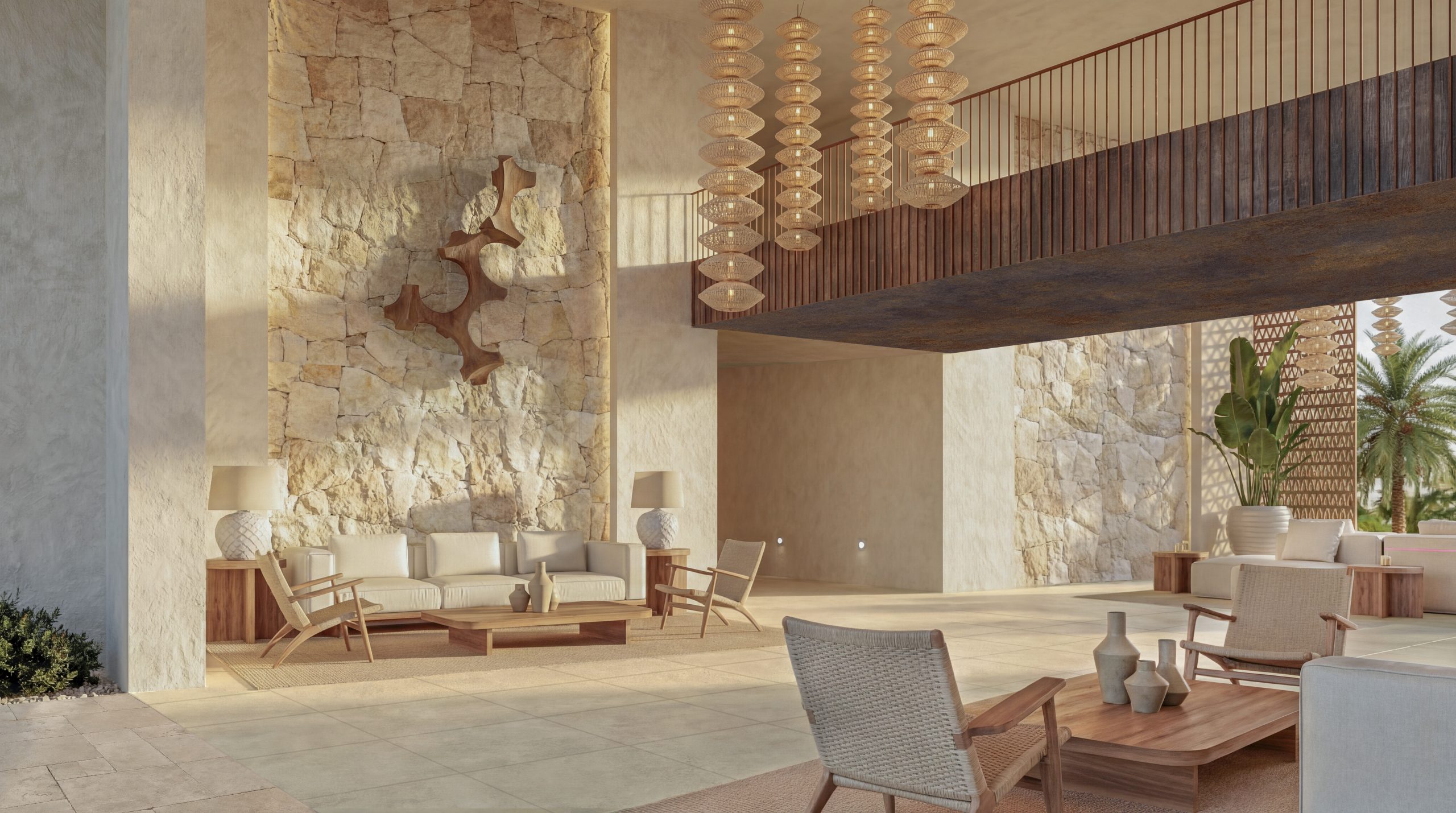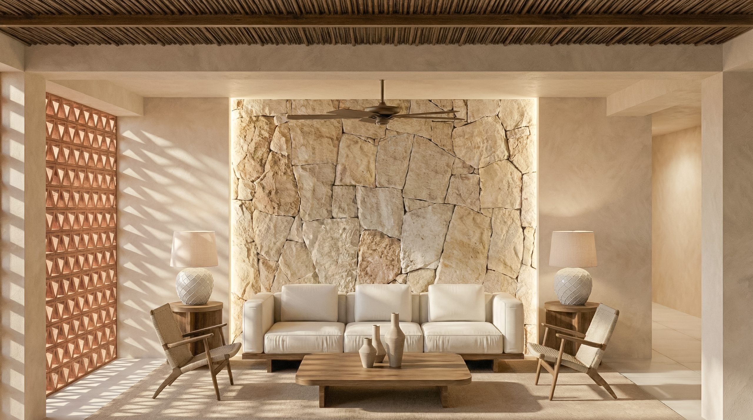 Para el diseño de interiores y de los espacios residenciales, Cuarto Interior ha desarrollado un lenguaje material que dialoga con el entorno tropical y responde a las condiciones climáticas del Caribe. Destaca la apuesta por mortero de cal y piedra natural como elementos base, también por celosías y cubiertas de paja y cañizo, que permiten filtrar la luz natural y proteger los espacios del sol. Tanto en las residencias como en las zonas comunes, la madera, el ratán, el mimbre, el lino, la piedra y las fibras vegetales aportan textura y naturalidad, generando ambientes luminosos y frescos.