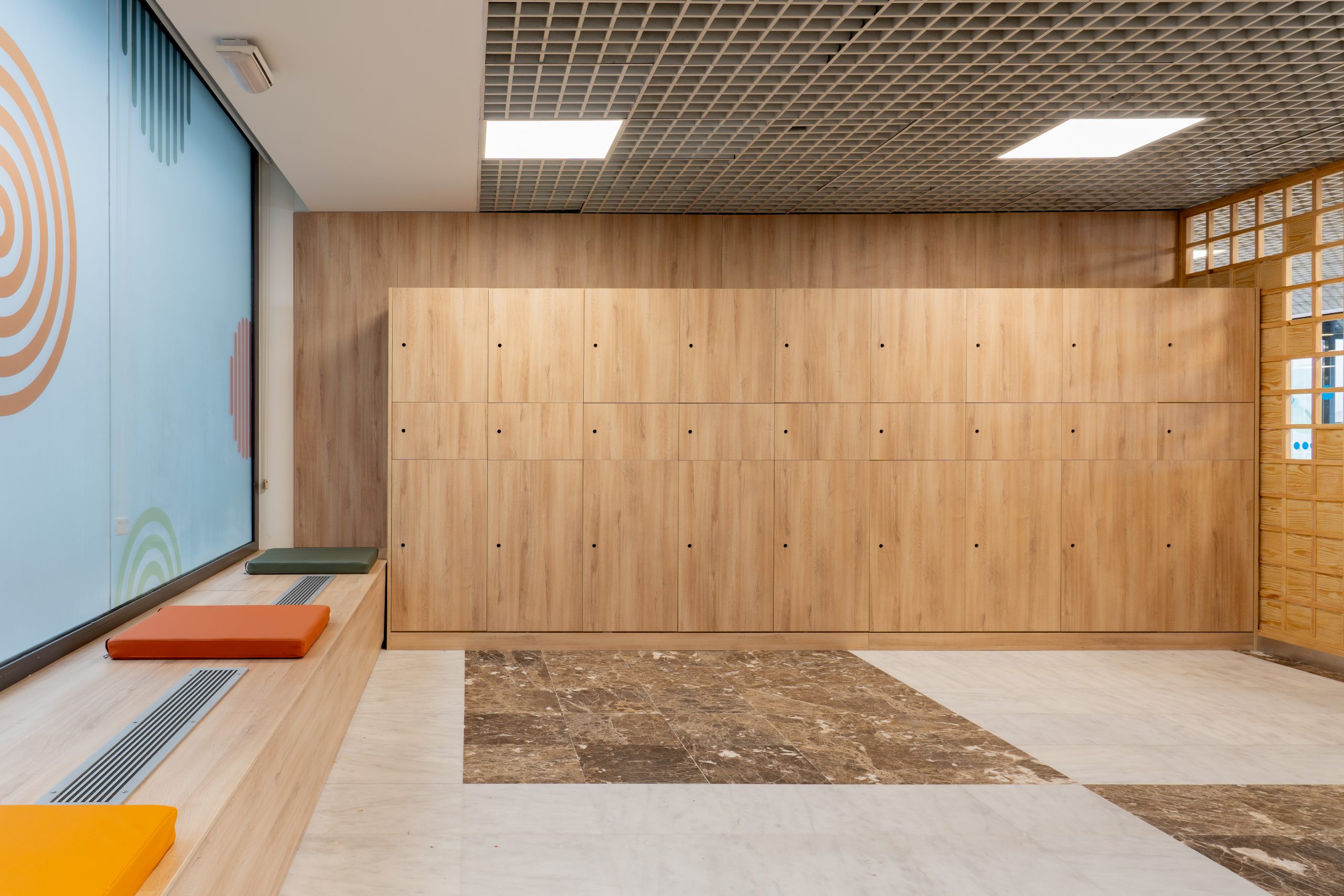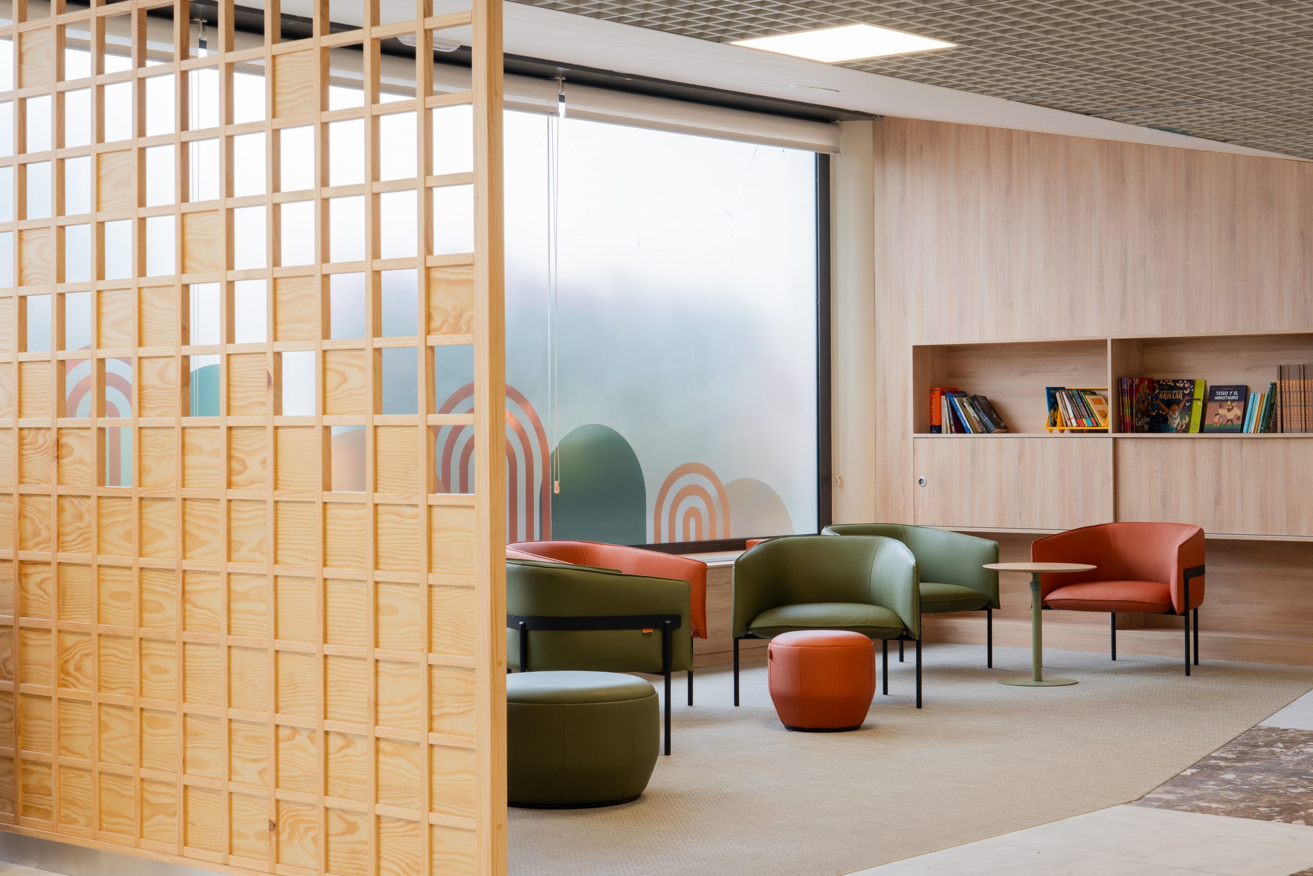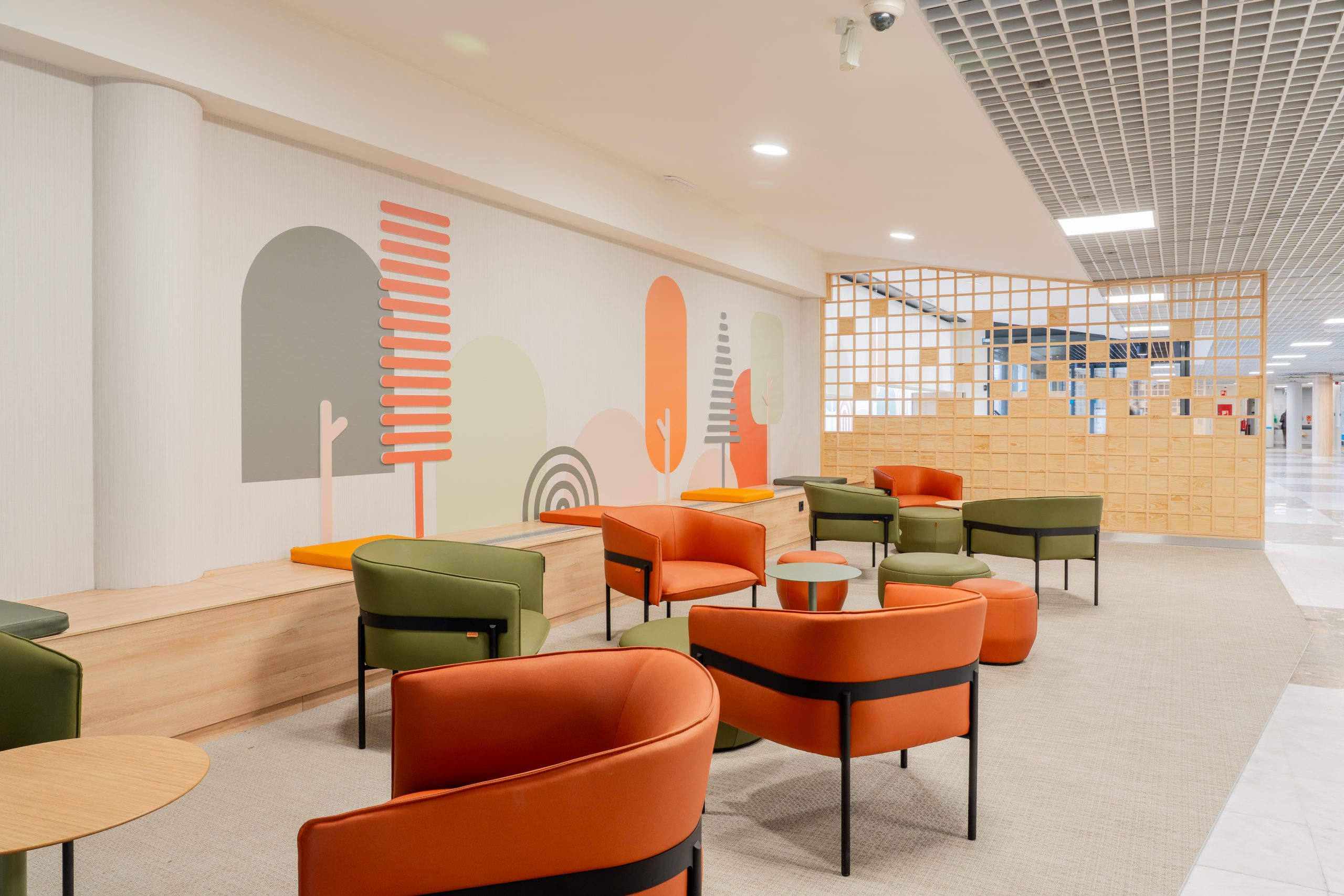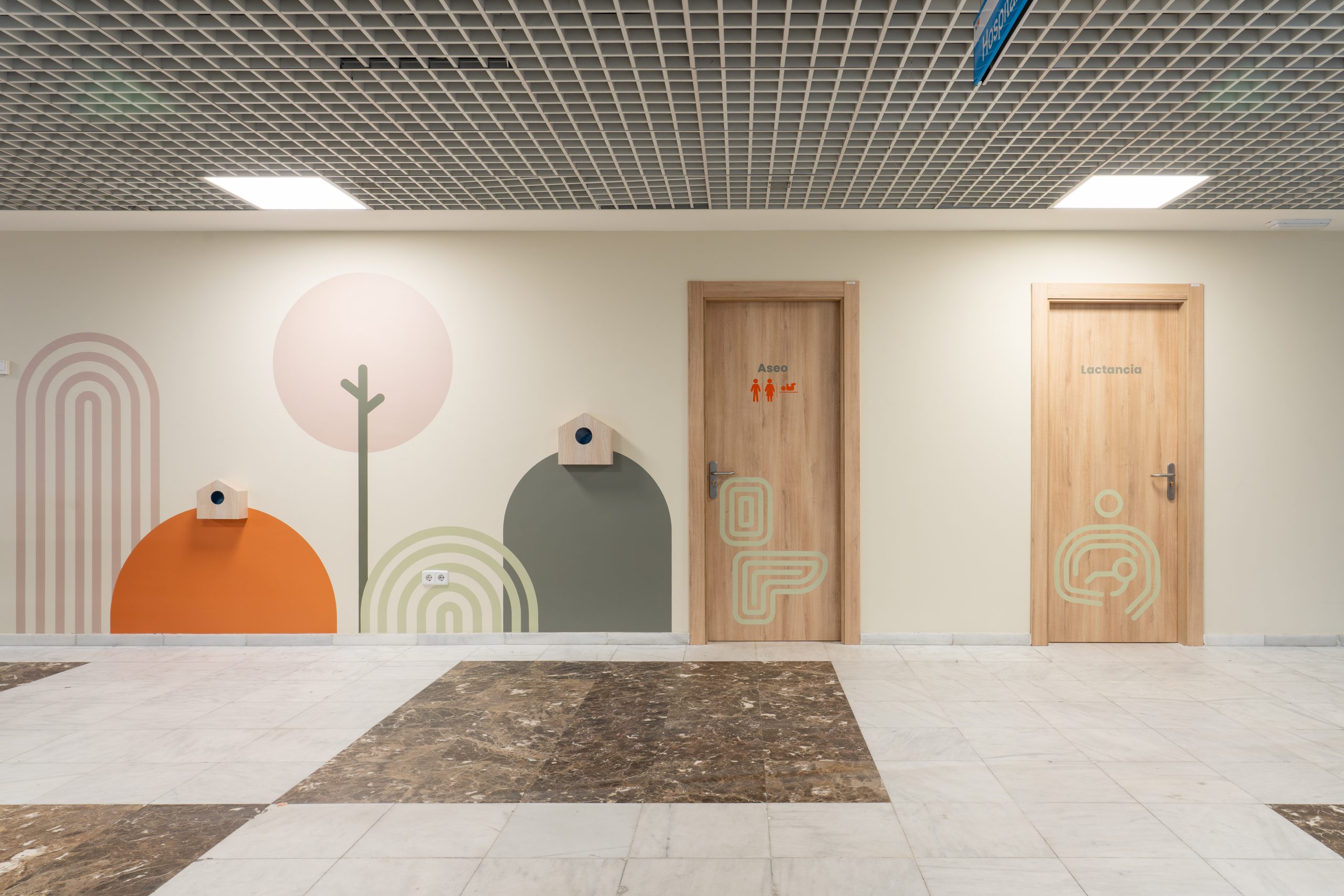Este enfoque se traduce en un ambiente más amable y reconocible, especialmente relevante en un área destinada a madres, niños y familias. La propuesta incorpora elementos que favorecen tanto la interacción como la privacidad mediante mobiliario flexible que permite configurar distintos espacios de uso.