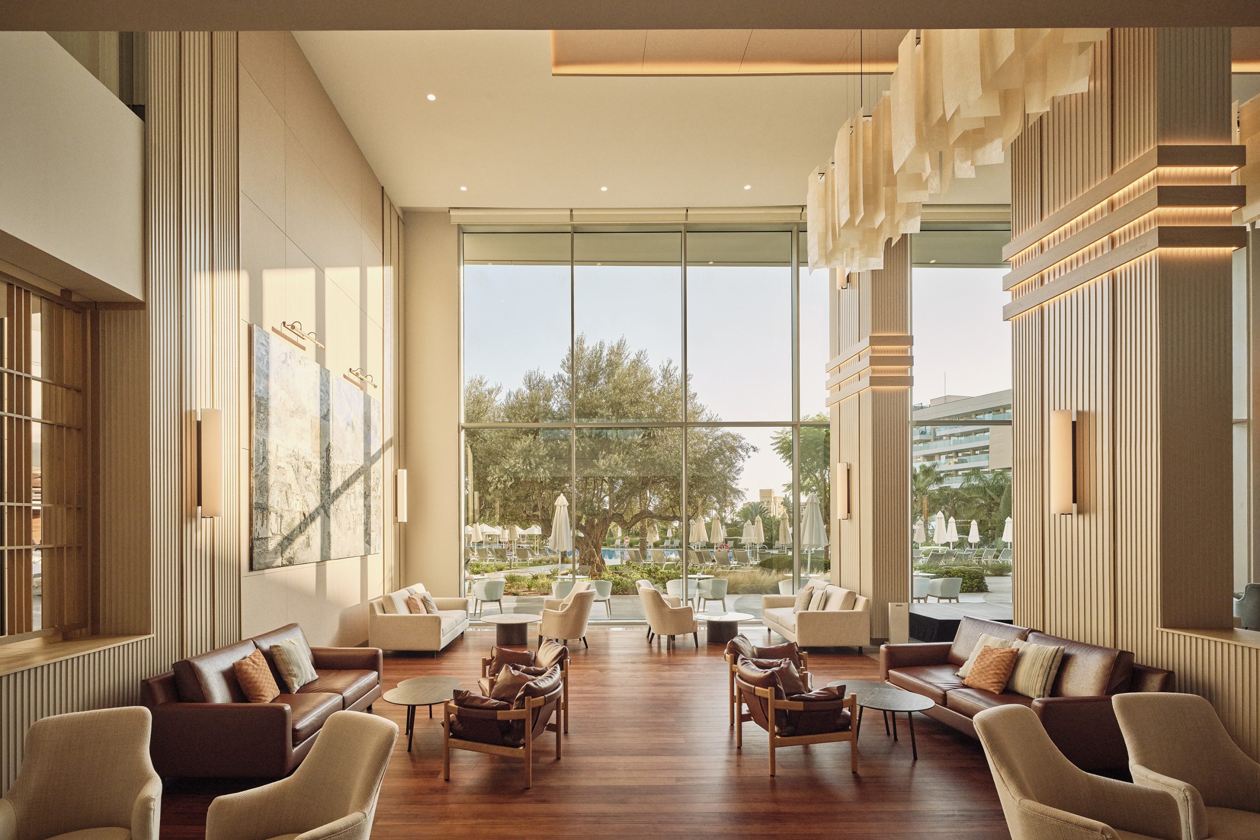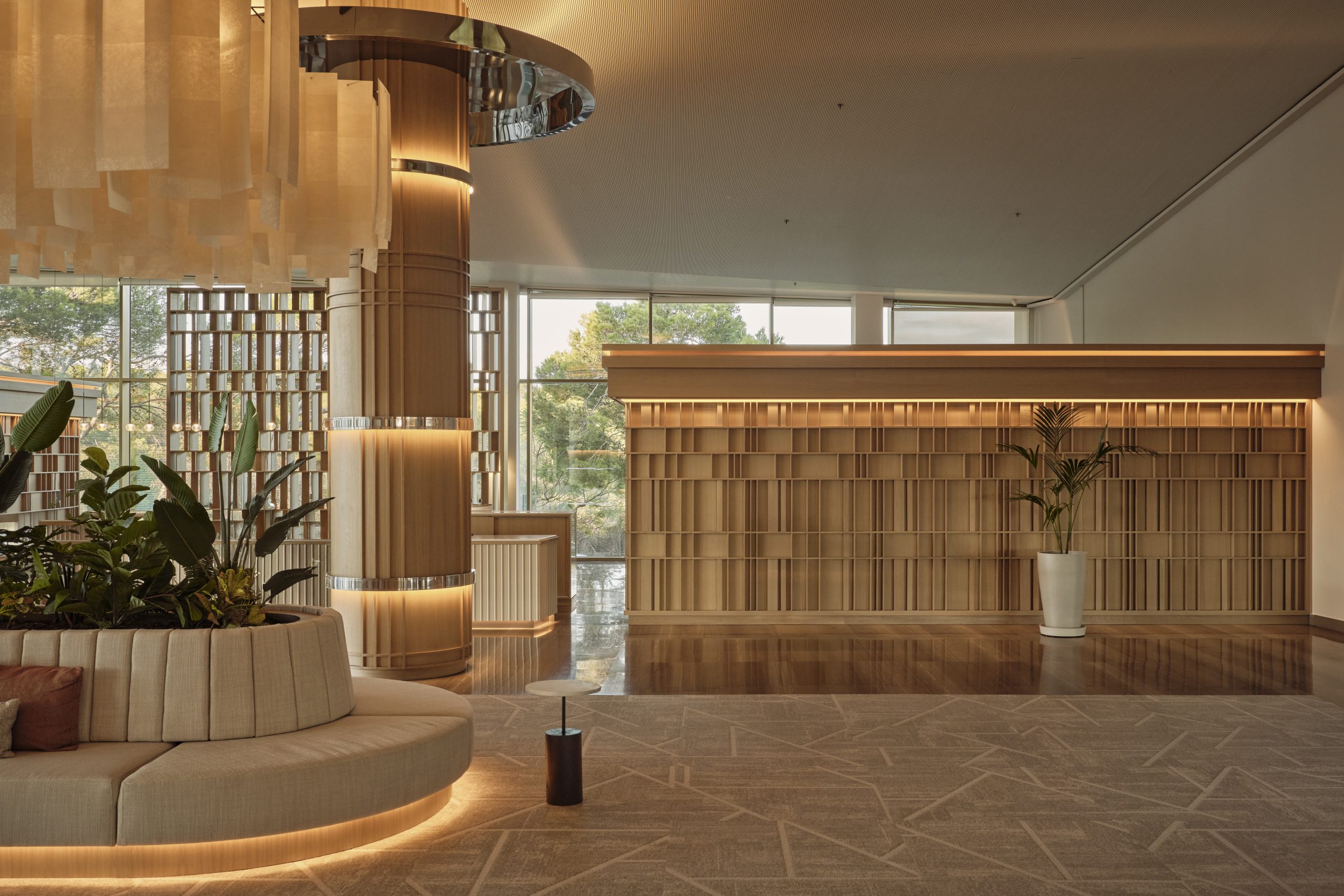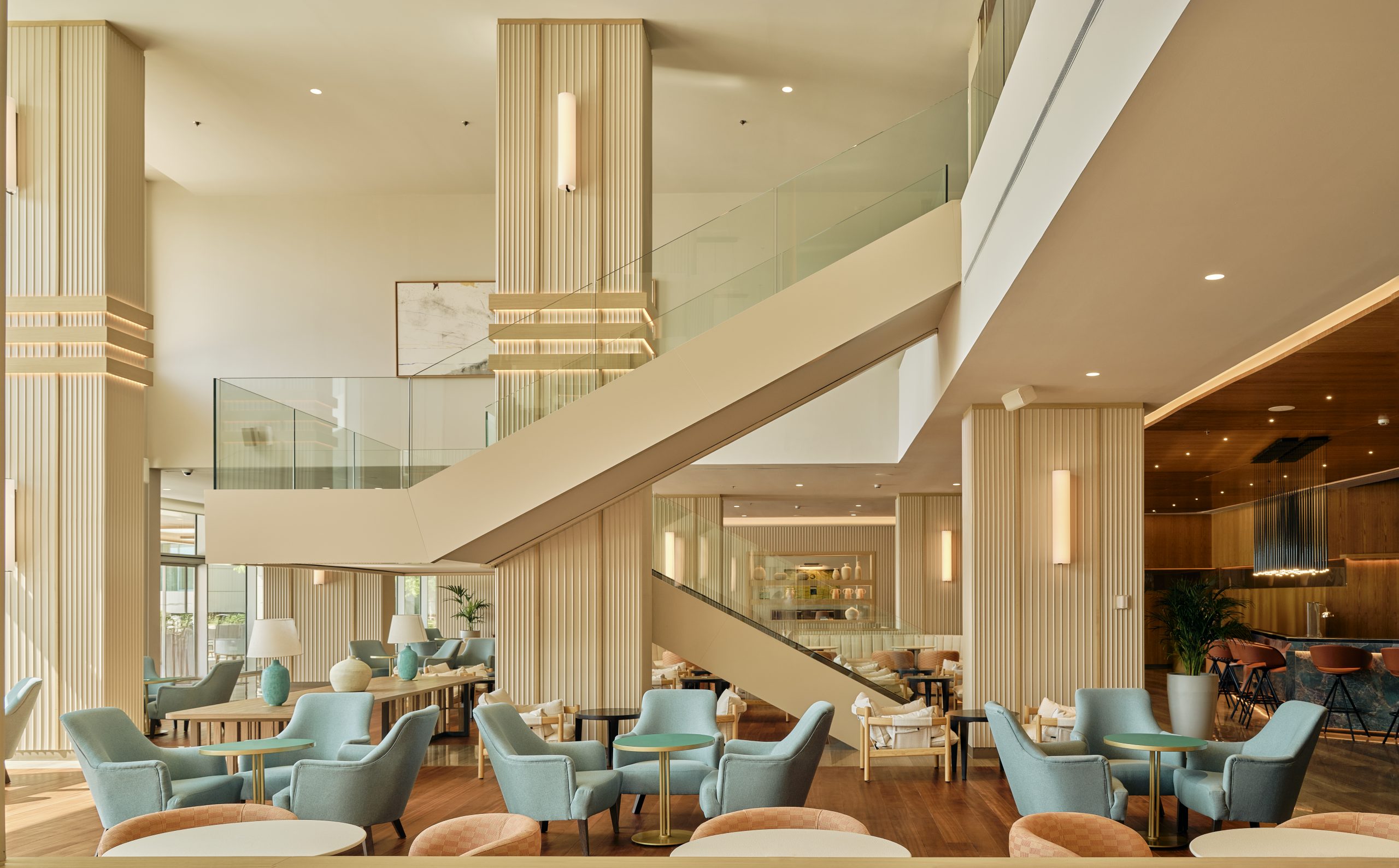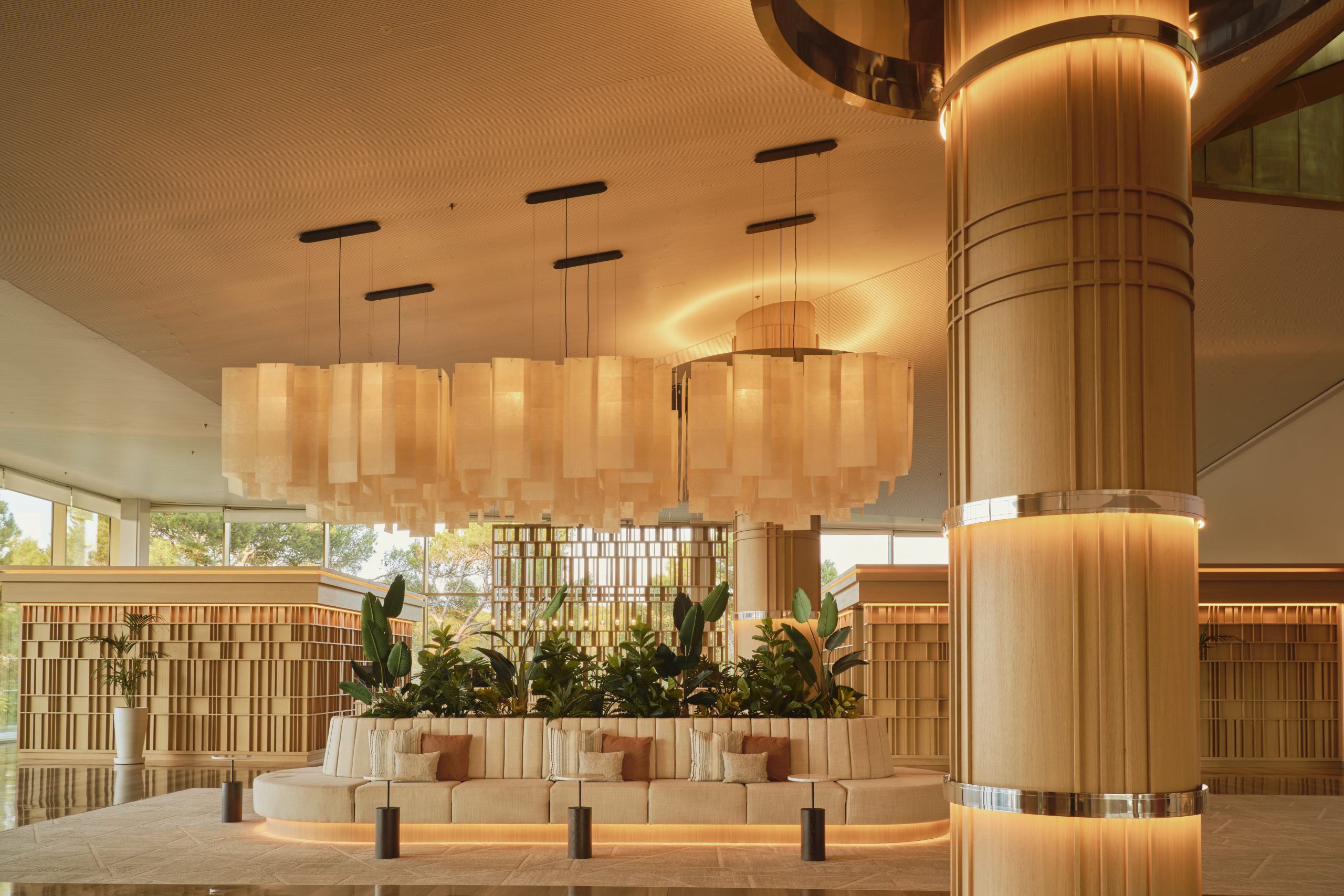El ambiente lujoso y relajante se construye con un diseño que prioriza las formas curvas y orgánicas (sofás, barras y mesas circulares) que fomentan la relajación, la conversación y eliminan las aristas duras, reforzando la sensación de bienvenida. Todo ello con una cuidada selección de materiales que aportan riqueza táctil y visual, como maderas naturales en tonos suaves, revestimientos acanalados y telas tapizadas con terciopelos ligeros, linos texturizados y bouclé.