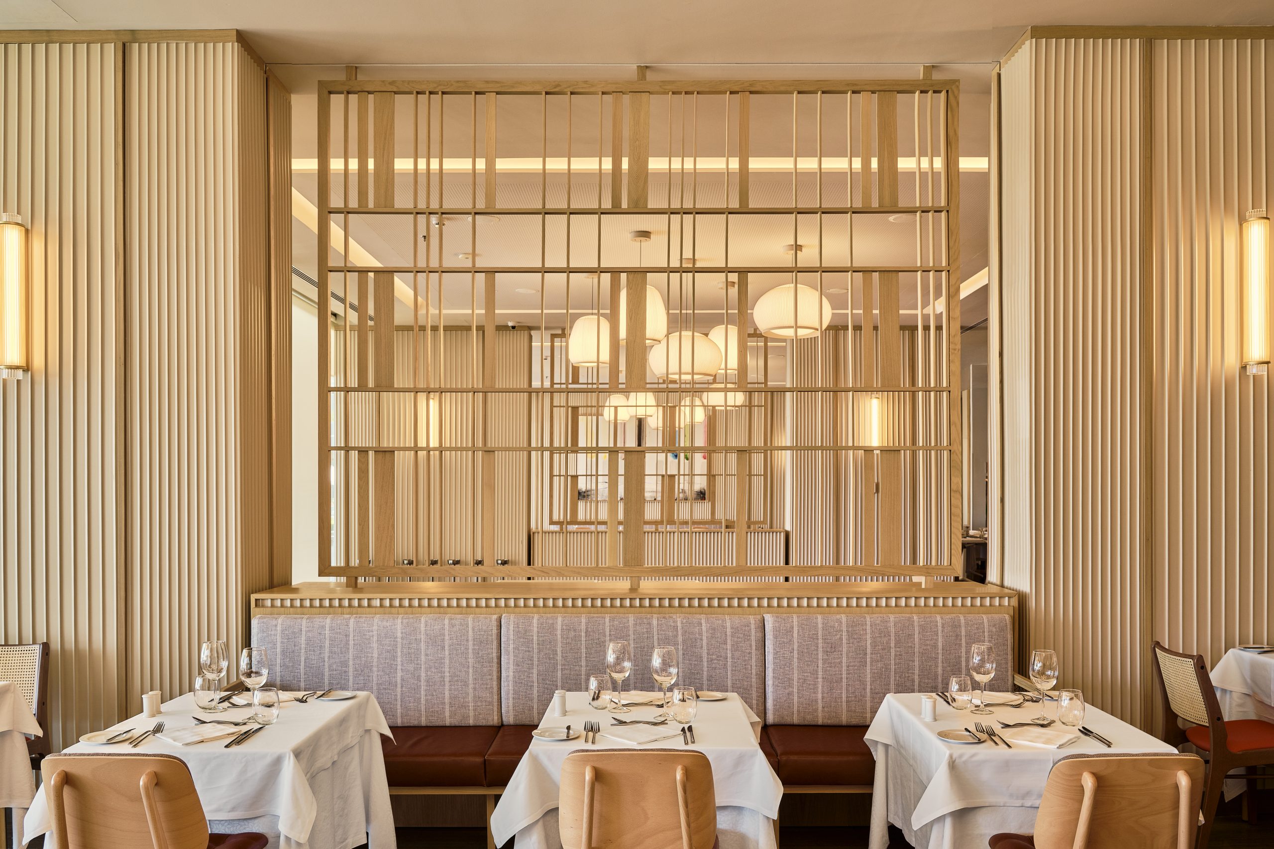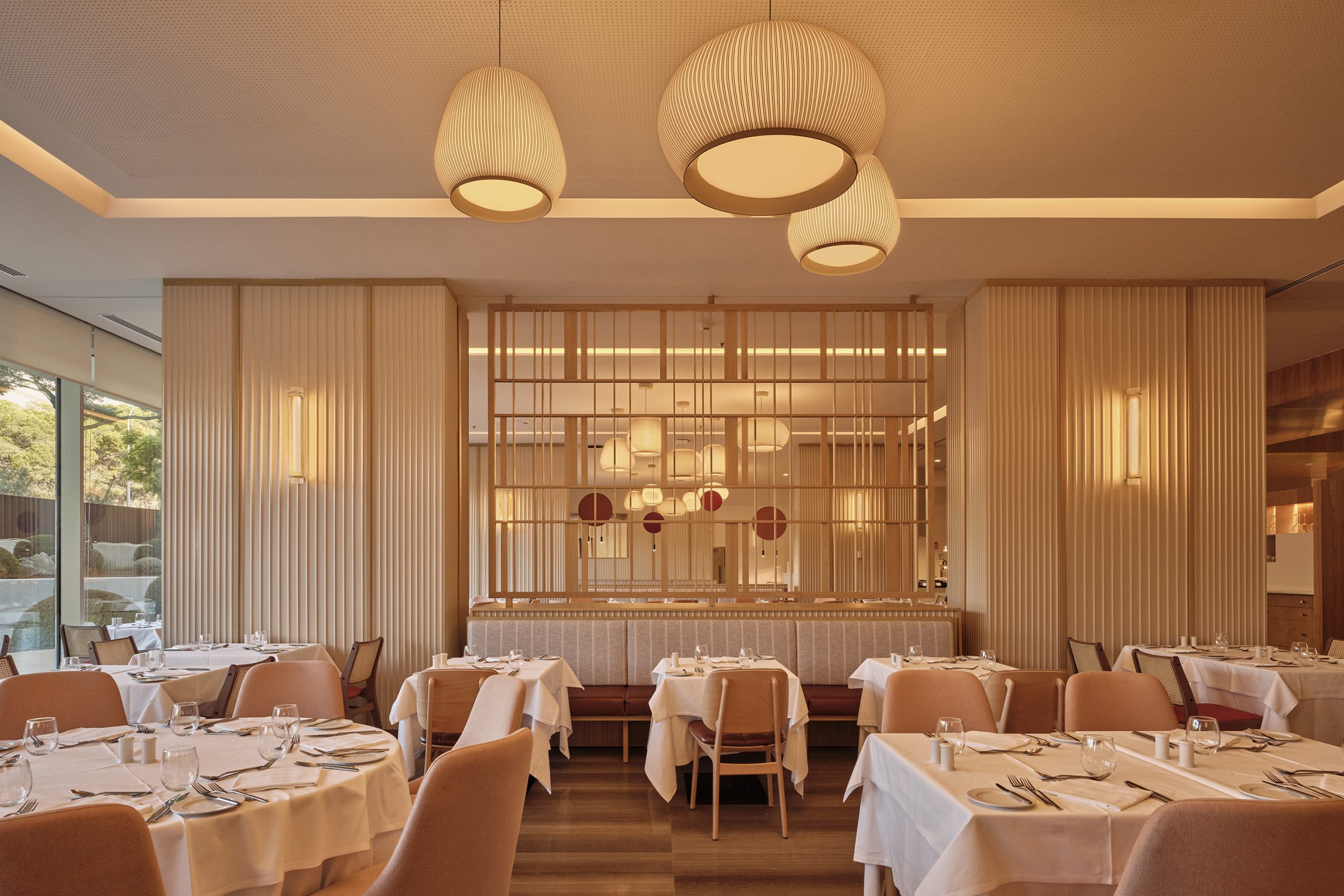 - Restaurante: El diseño del restaurante es elegante y etéreo. Paneles de listones verticales y una celosía de madera actúan como separadores sutiles, creando intimidad. Las lámparas de suspensión, con pantallas tejidas de fibra natural, suavizan la luz sobre cada mesa, manteniendo la calidez dorada y la atmósfera íntima, ideal para una experiencia culinaria de 5 estrellas.