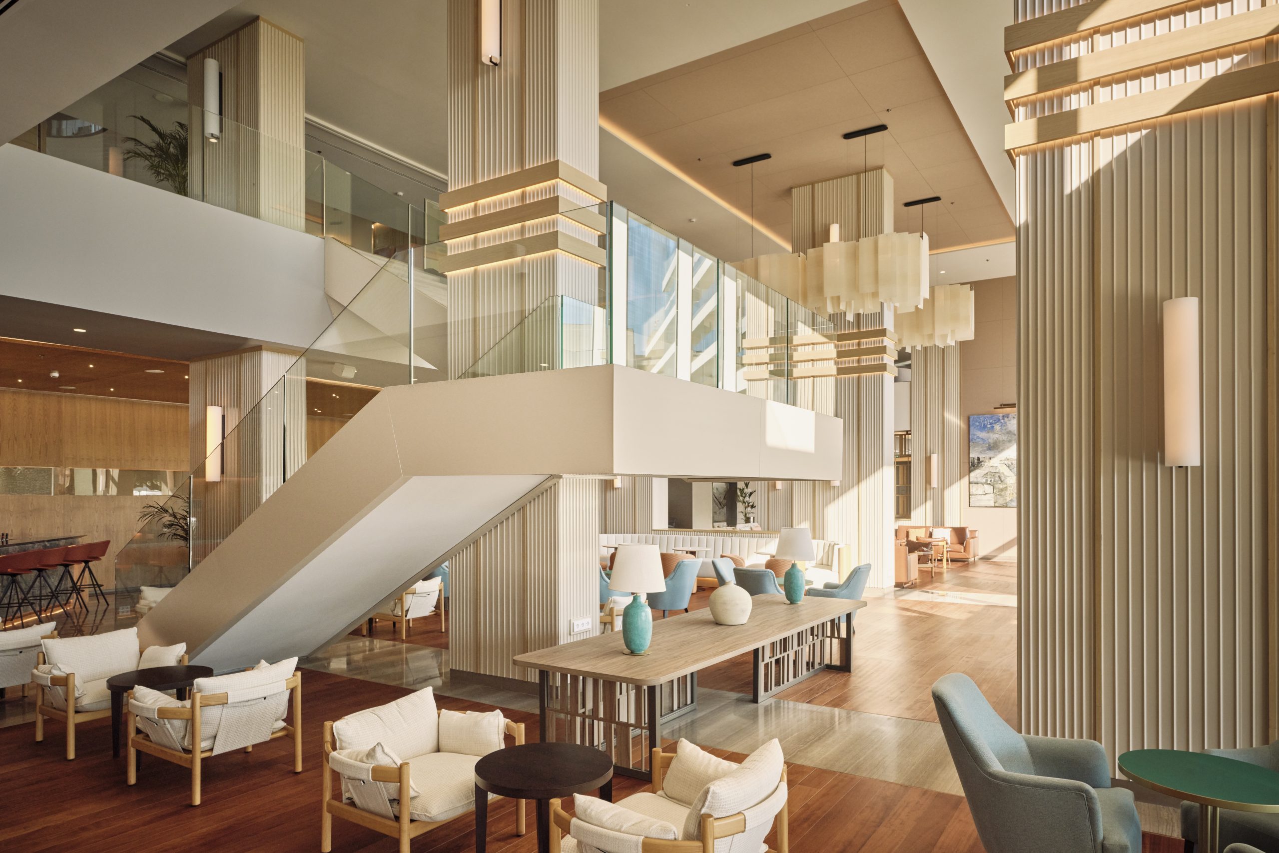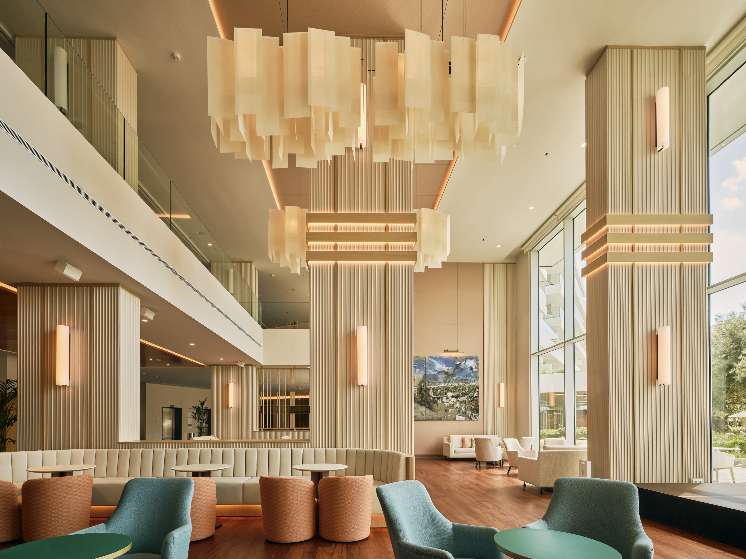 - Salón común y áreas de descanso: Una evolución natural del lobby, con una paleta cálida y acentos de color turquesa y melocotón que rompen con la neutralidad de los revestimientos. La generosa altura de los techos destaca con una espectacular selección de lámparas suspendidas.