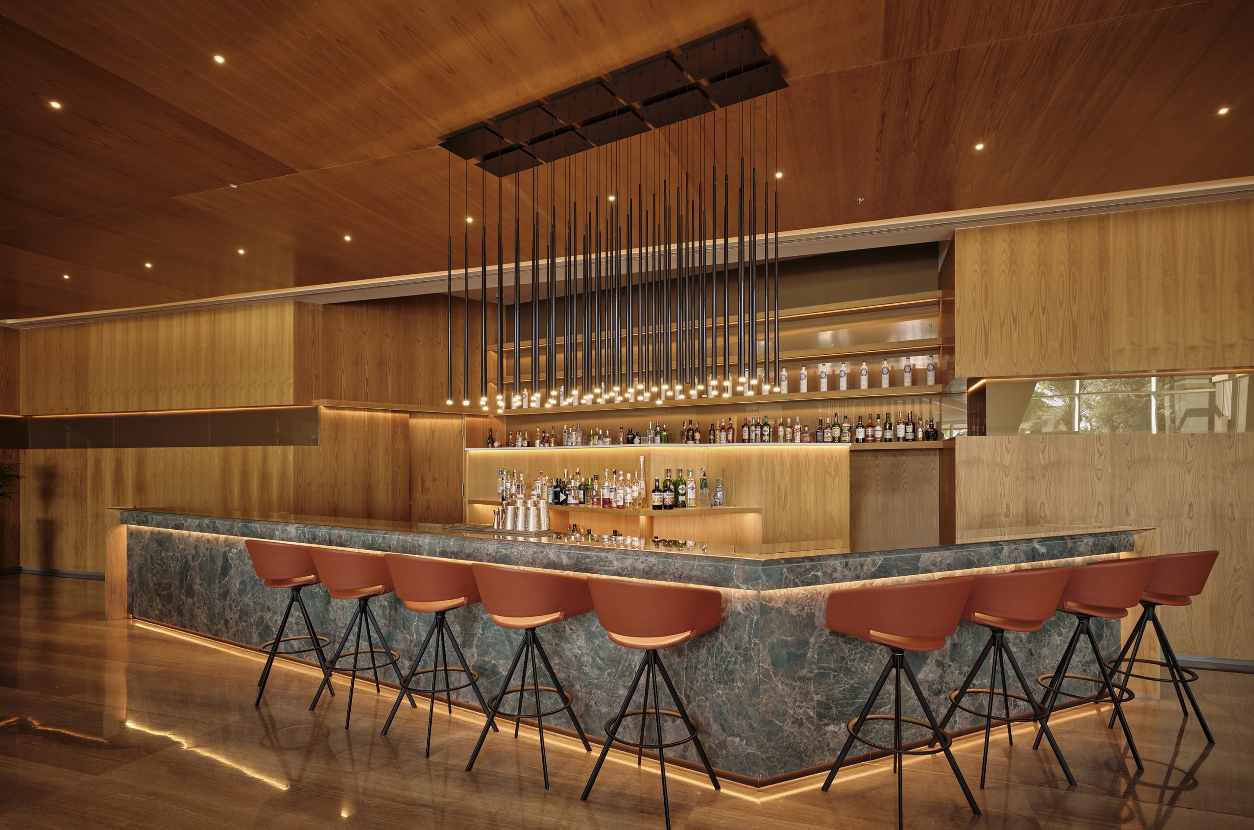 - Bar Lounge: El Bar Lounge ha sido concebido como un espacio dinámico, diseñado para albergar tanto una interacción social vibrante como momentos de tranquilidad. La barra de mármol iluminada actúa como pieza protagonista. La fuerza de los tonos terracota y melocotón en banquetas y sillas tapizadas, junto con el techo y las paredes en madera pulida, reflejan la luz y añaden cierto toque de glamour retro al ambiente.