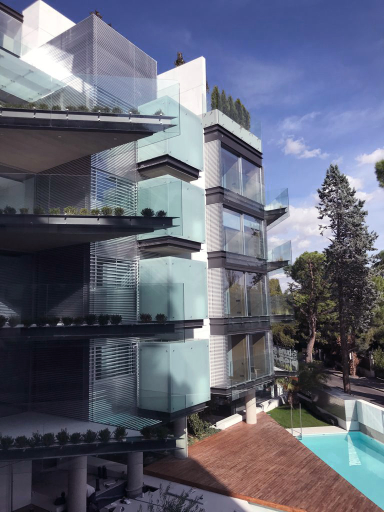 Madroños 29, que destaca por tener una volumetría singular, gira sus fachadas 45º para conjugar orientación y buenas vistas. Sus viviendas disponen de un área privada a partir de 250 m2 y un programa dominante con salón-comedor, cocina-oficio, 4 dormitorios en suite y grandes terrazas ajardinadas, se crean tres tipologías distintas: viviendas de planta baja con jardines privados y piscinas individuales, viviendas en plantas intermedias volcadas sobre sus terrazas y viviendas-ático con jardines y piscinas conectados espacialmente con el espacio interior a través de grandes paños de vidrio.