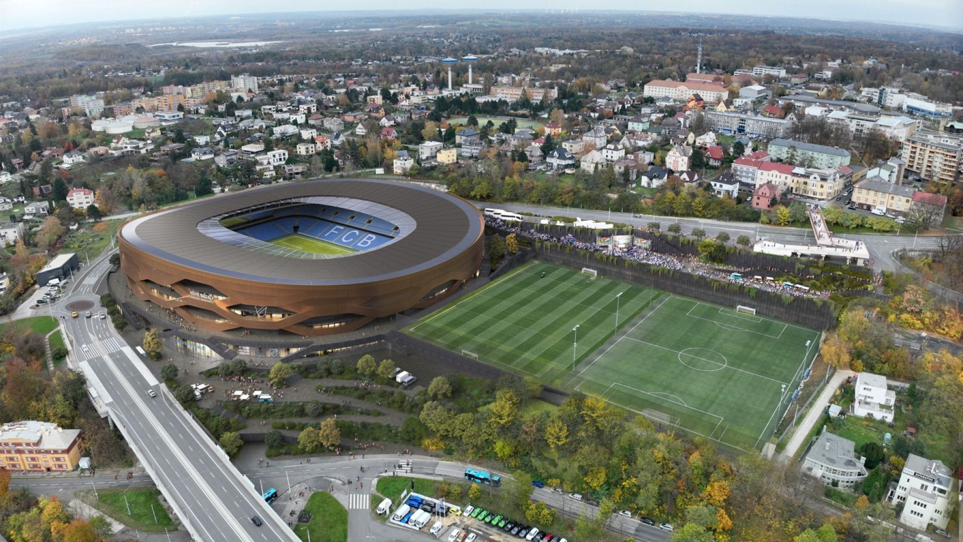 Situado en la ladera de una antigua cantera de basalto y en pleno corazón del histórico barrio de Bazaly, el nuevo estadio diseñado por L35 se concibe como un hito urbano profundamente vinculado al carácter industrial de Ostrava.