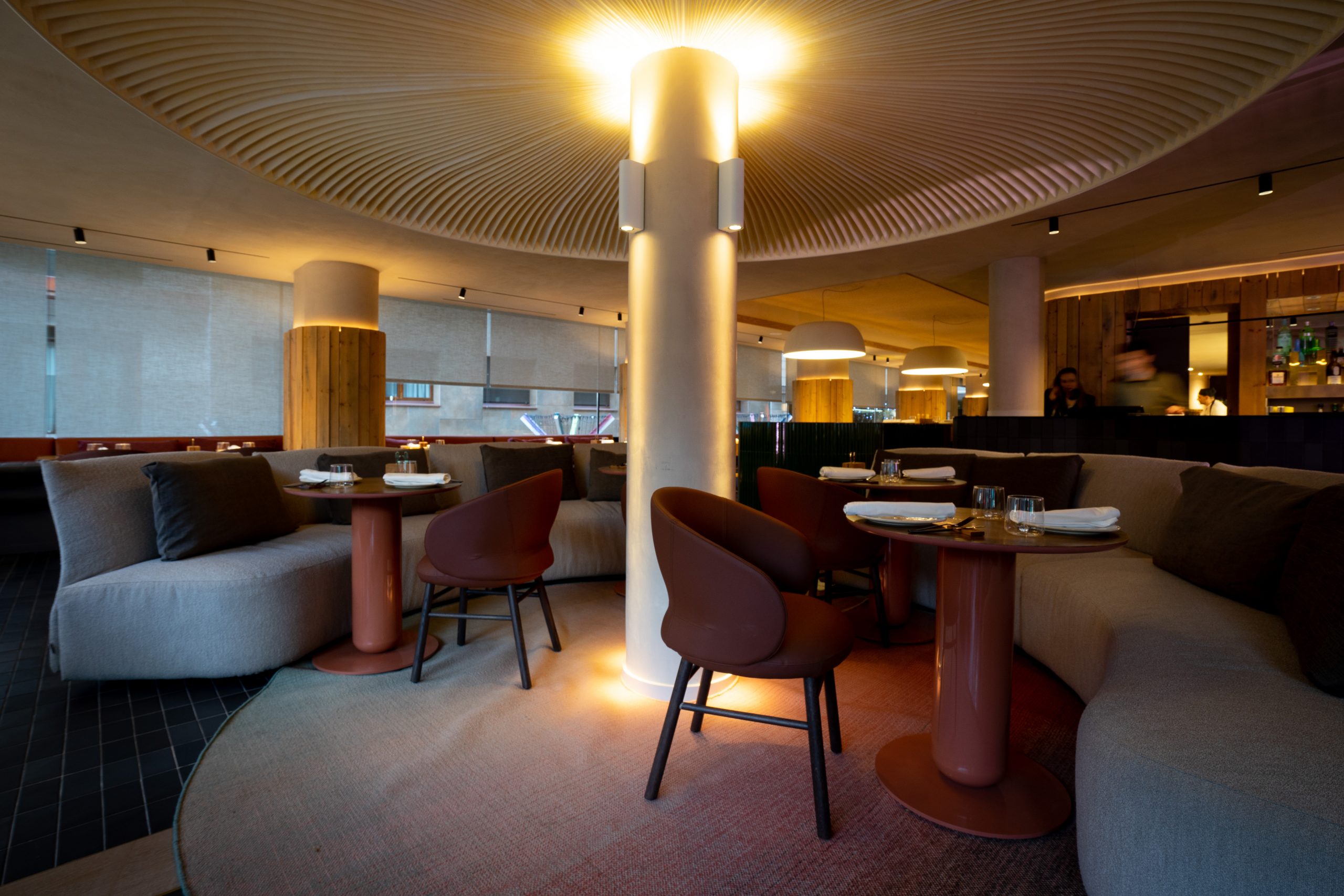 Lagranja ha diseñado un gran banco tapizado perimetral, que sigue todo el ventanal. Distintos pilares extra large revestidos en madera esconden la estructura del edificio y segmentan diferentes zonas de asientos.