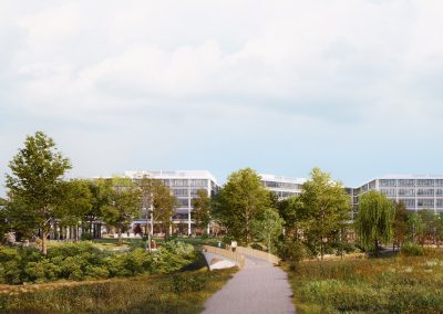 Este objetivo se consigue mediante una calle peatonal que atraviesa el campus a modo de espina dorsal pública que conecta la ciudad con un parque.