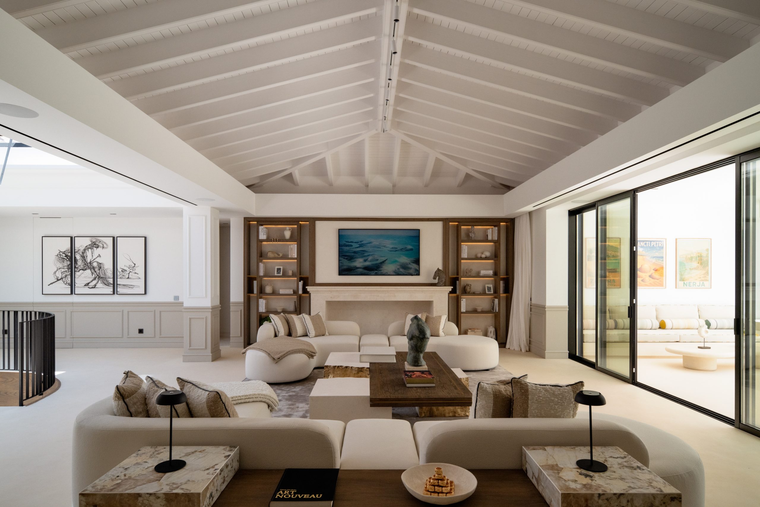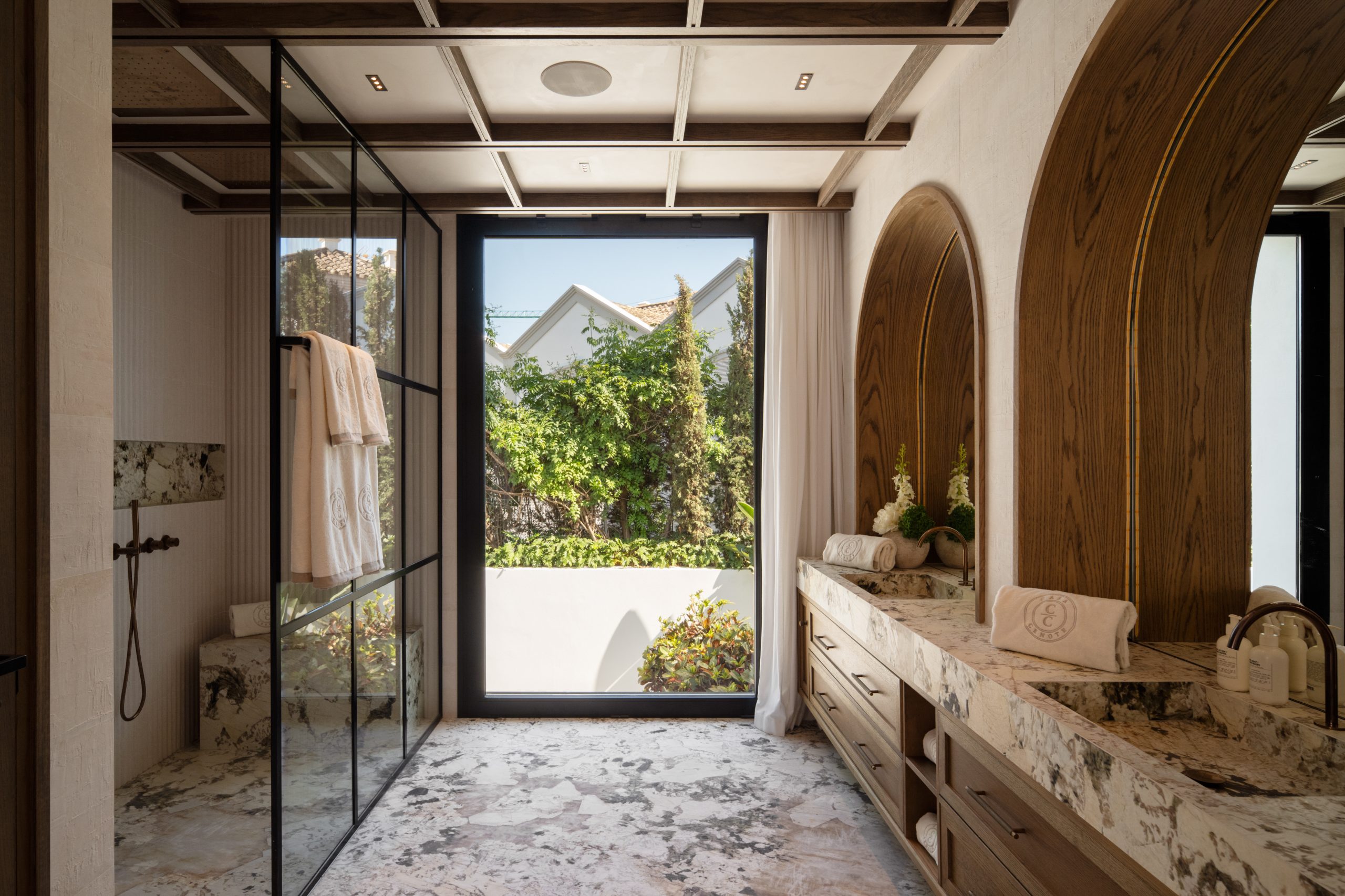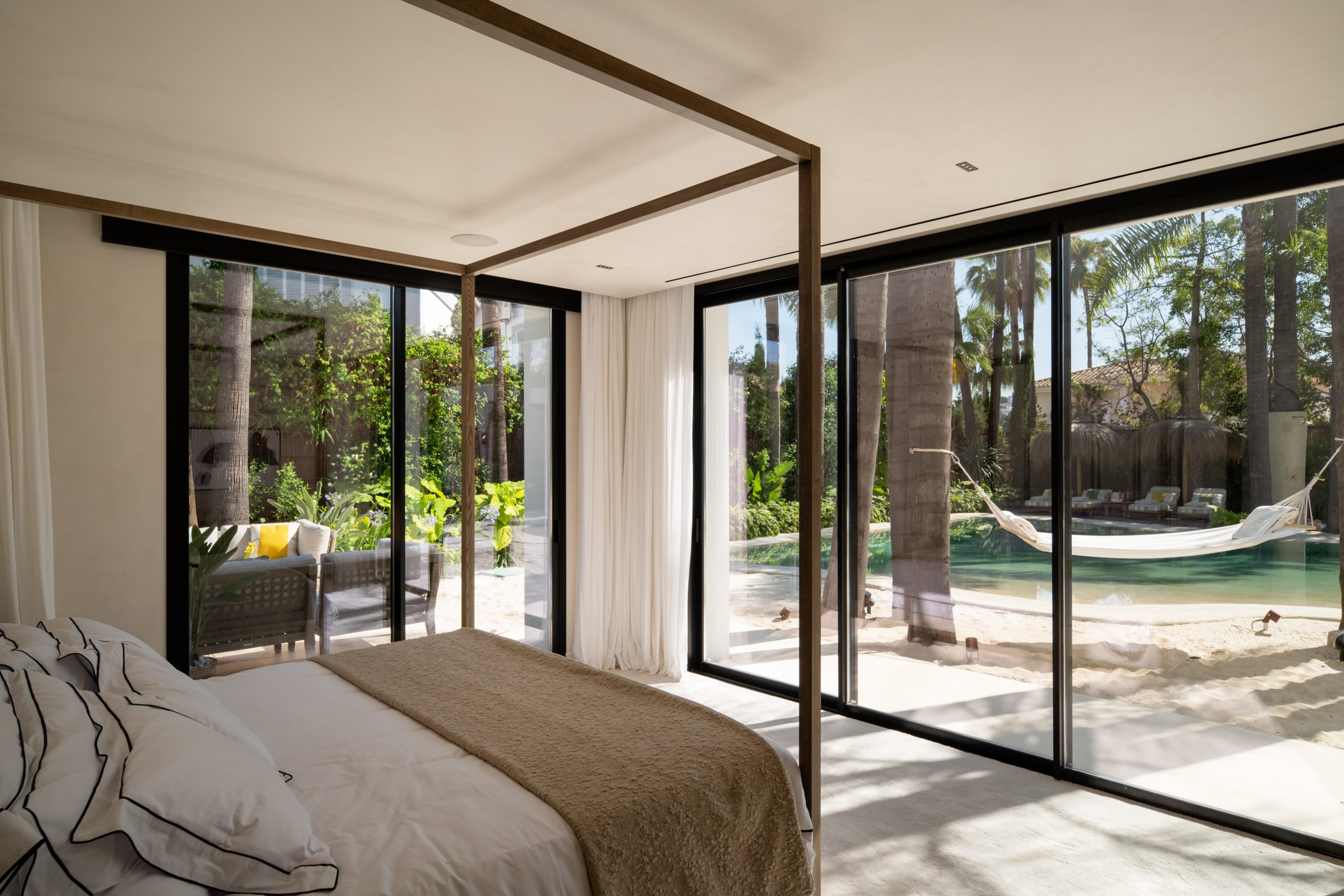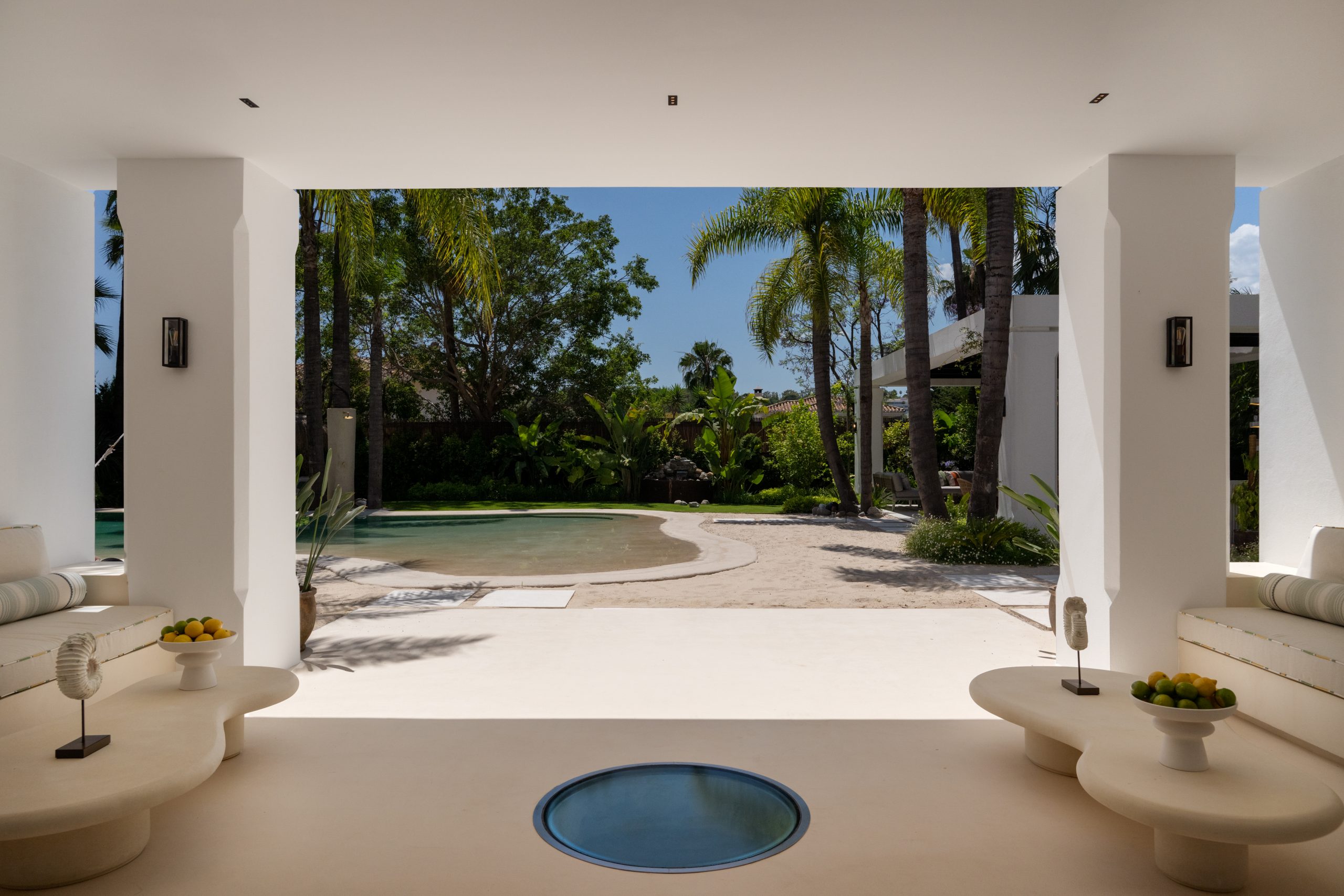 Por su parte, el exterior se concibe como un pequeño paraíso privado. Ante la ausencia de vistas al mar, OMEO Design crea una playa interior con arena blanca inspirada en la costa de Marbella. Palmeras, mobiliario de teca y bambú, una ducha oculta al aire libre y un solárium completan el ambiente. Al fondo del jardín se levanta un pabellón con techo de bambú que alberga una zona de comedor y barbacoa con bar, evocando una atmosfera al más puro estilo balinés.