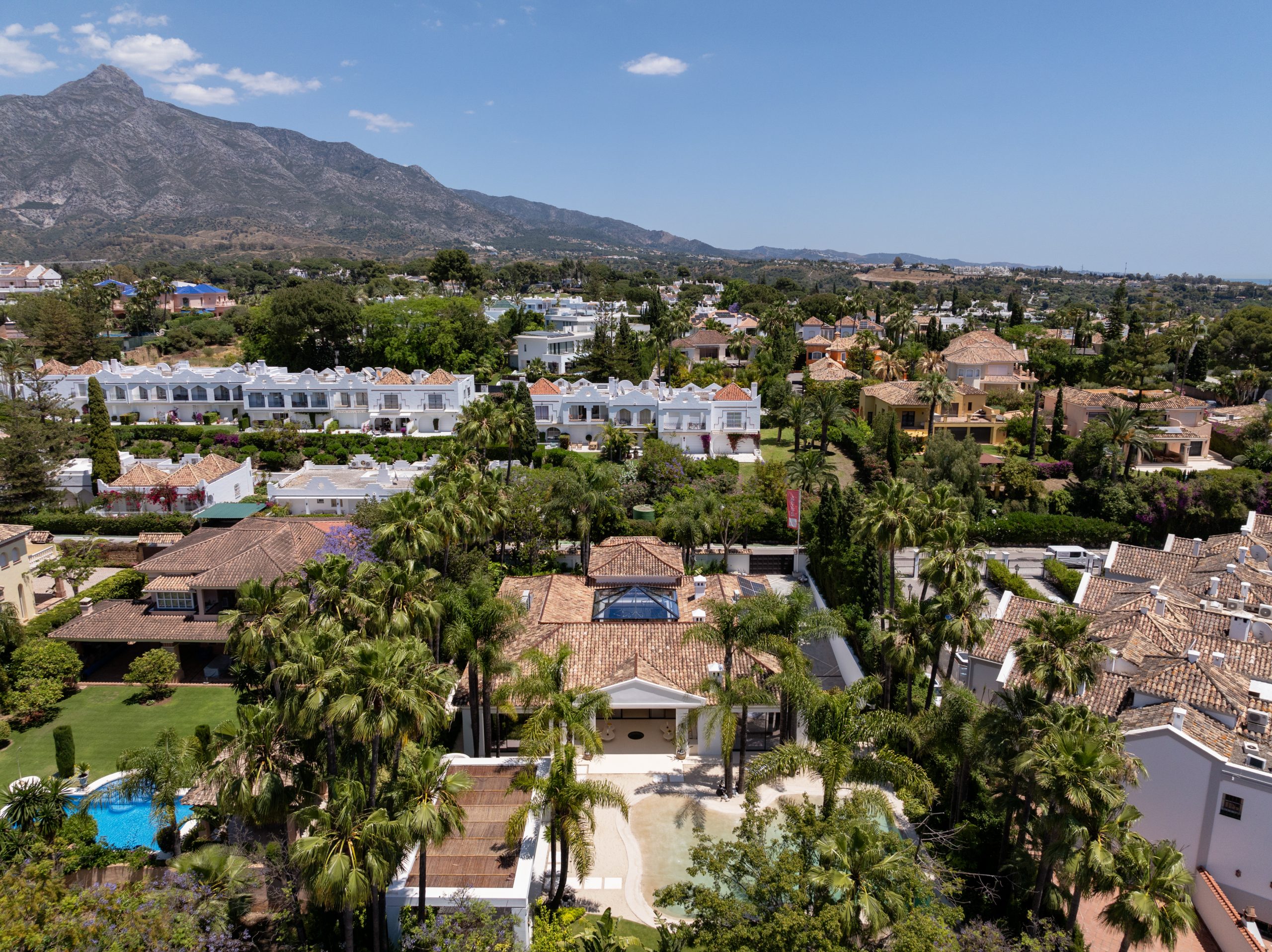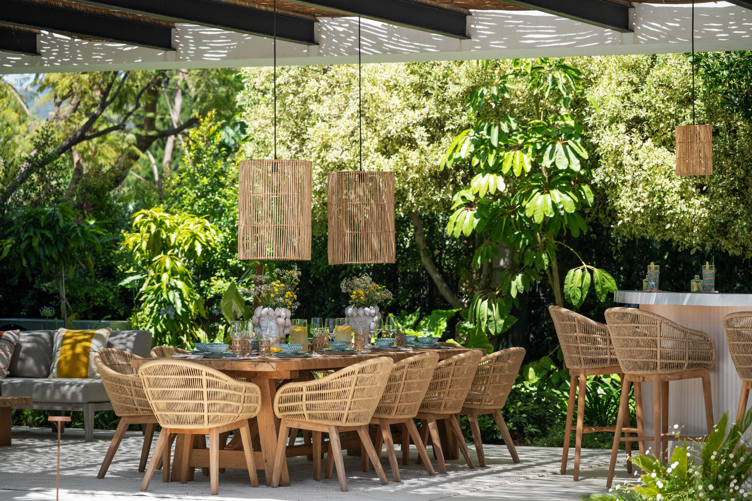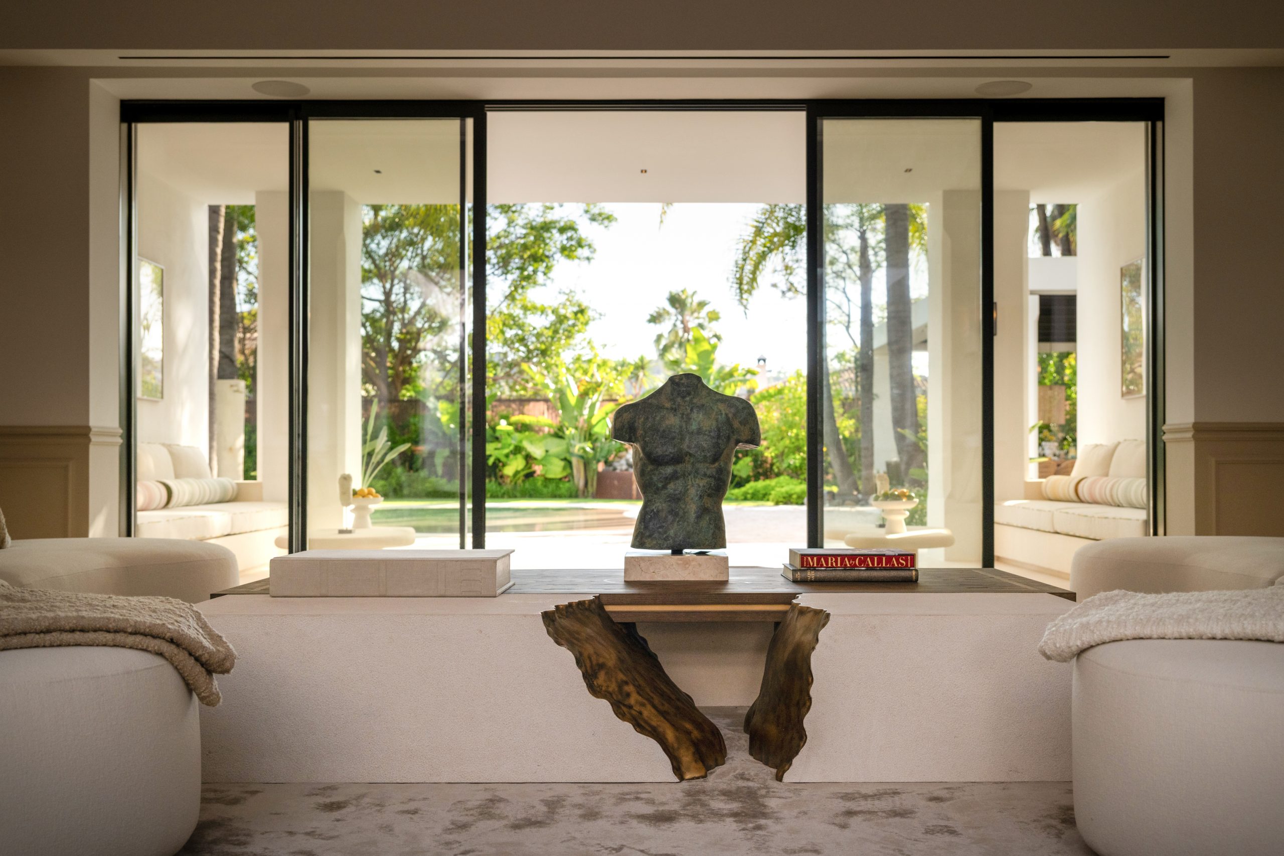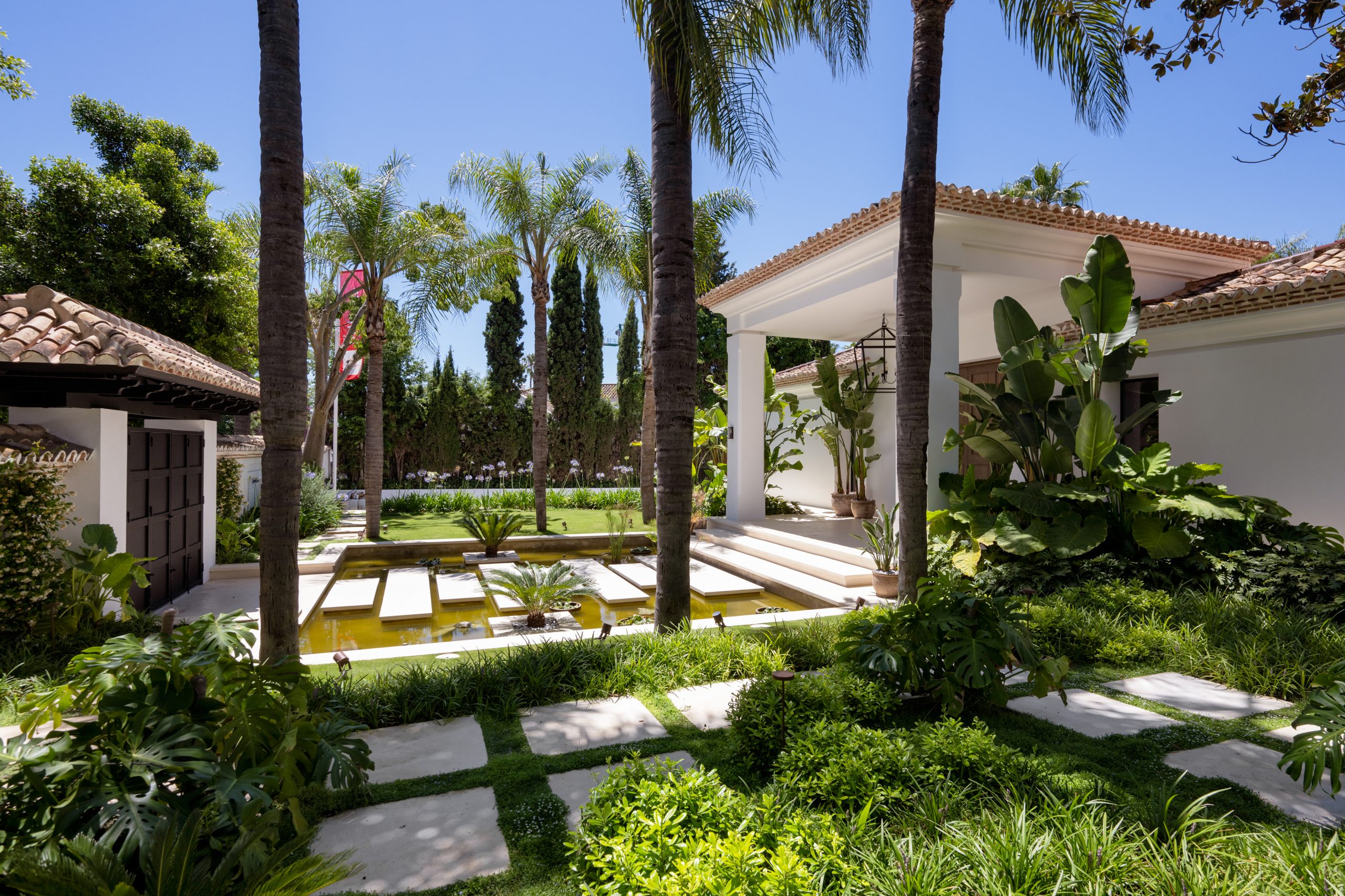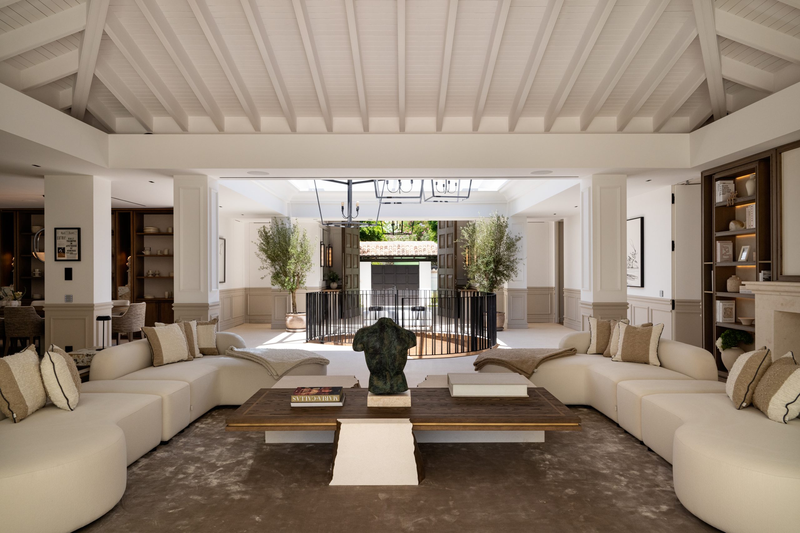 Por su parte, el exterior se concibe como un pequeño paraíso privado. Ante la ausencia de vistas al mar, OMEO Design crea una playa interior con arena blanca inspirada en la costa de Marbella. Palmeras, mobiliario de teca y bambú, una ducha oculta al aire libre y un solárium completan el ambiente. Al fondo del jardín se levanta un pabellón con techo de bambú que alberga una zona de comedor y barbacoa con bar, evocando una atmosfera al más puro estilo balinés.