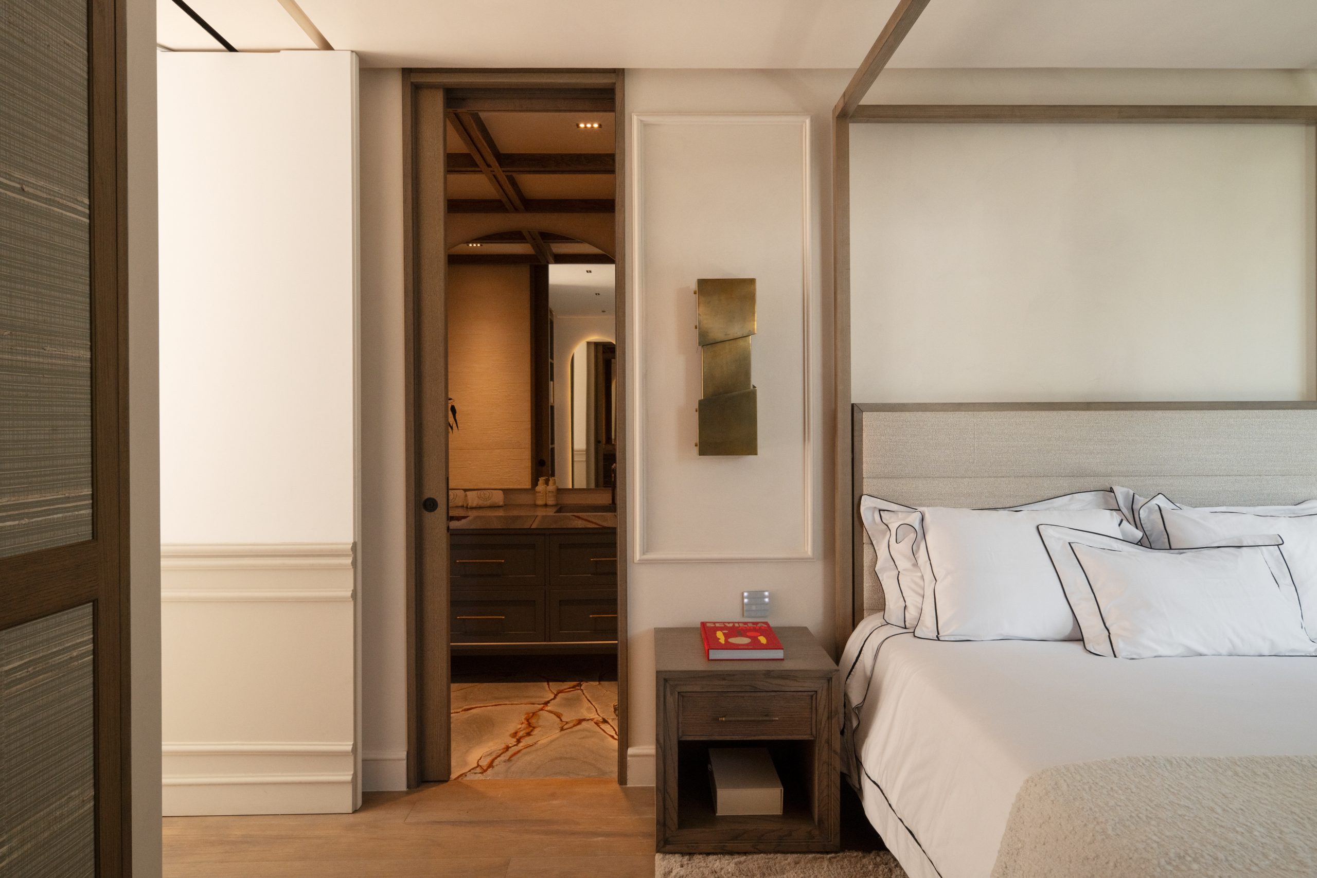 Los dormitorios, todos con baño ensuite, continúan el lenguaje de la vivienda con distintos tonos y mármoles. Los suelos, encimeras y nichos se revisten de piedra natural, mientras que las paredes alternan baldosas lisas y curvas. Los techos, realizados en carpintería de roble y acabados en microcemento, se adaptan a la paleta de cada estancia. La iluminación indirecta y los espejos curvos aportan una atmósfera suave y envolvente.