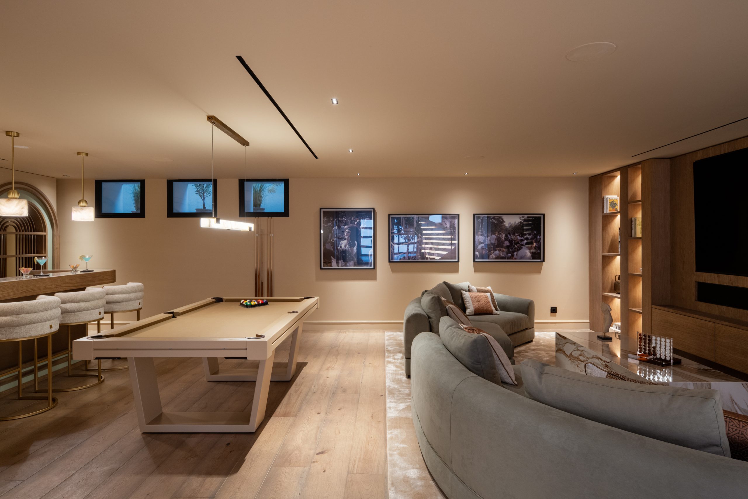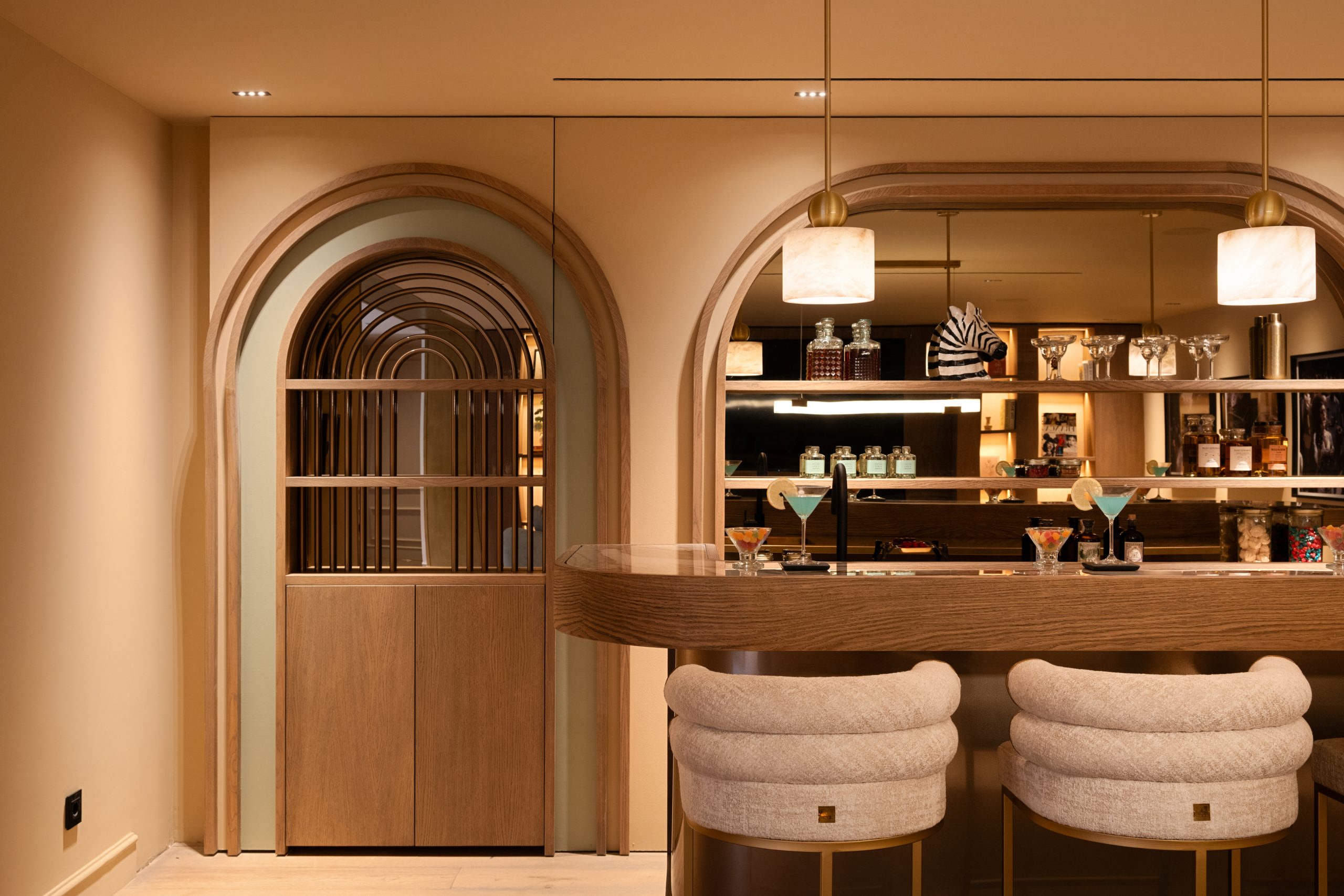 Pero, sin lugar a dudas, el mayor hallazgo está en el sótano: un área escondida donde se fusiona lo íntimo con lo lúdico. Allí encontramos la zona de lavandería con terrazo verde menta, un bar inspirado en los años 60, una cava de vinos y, lo más sorprendente, un spa inspirado en un cenote.