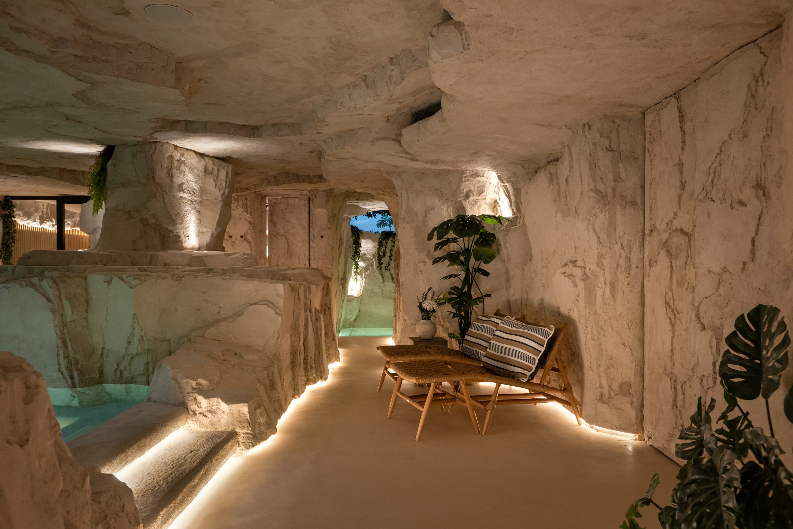 Se trata de un espacio tipo cueva realizado en piedra natural, piscina interior, plunge frío, sauna, hammam y luz filtrada desde una claraboya. Para completar este santuario de calma, OMEO Design ha integrado un gimnasio con zonas tanto interiores como exteriores.