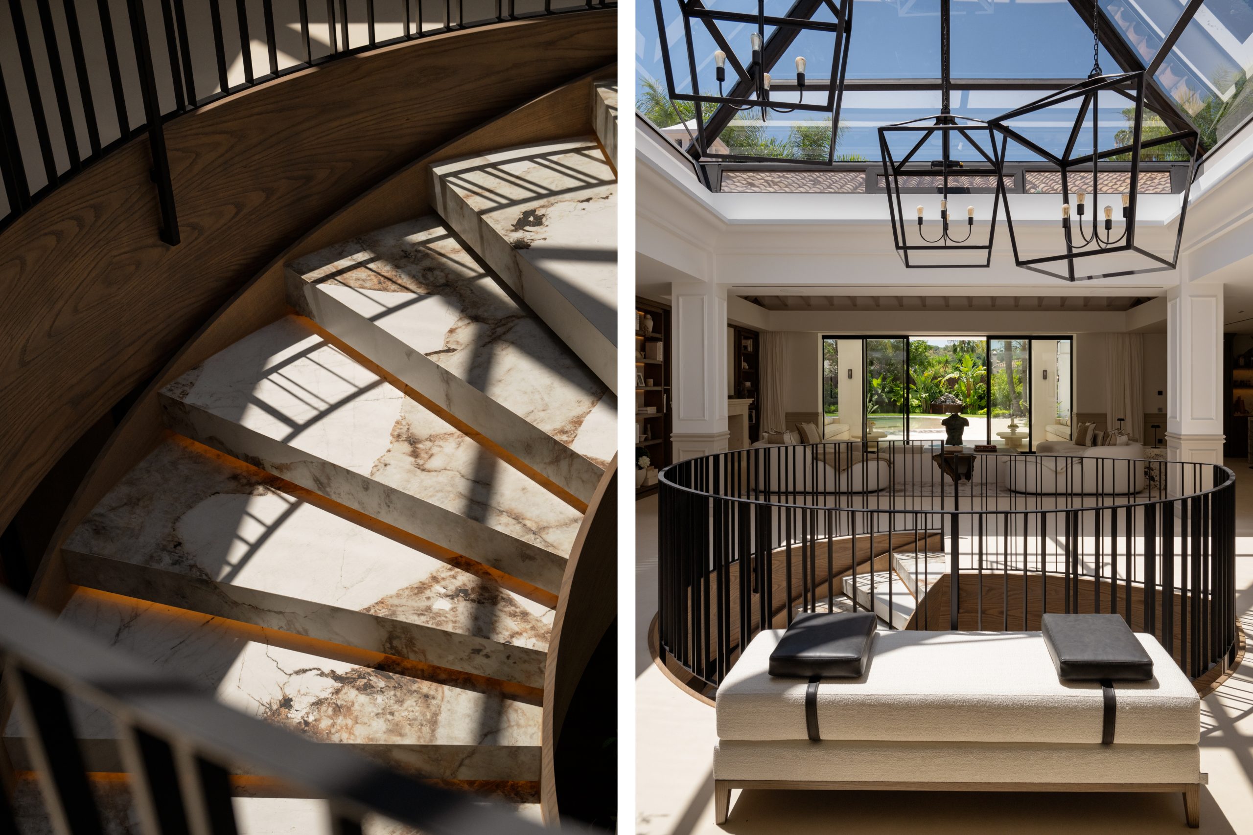 Desde la entrada, la casa revela su carácter único con unas imponentes puertas de roble de 3,3 metros, un gesto arquitectónico que se repite en distintos puntos del proyecto. En el interior, las paredes incorporan molduras y consolas de piedra rematadas con carpintería, mientras una gran claraboya permite que la luz natural caiga sobre tres lámparas de metal negro, un acabado presente también en marcos, luminarias, interruptores y en la barandilla de la escalera. Esta apertura superior ilumina incluso el sótano gracias a la escalera de mármol curvo, rematada con detalles en roble y latón.